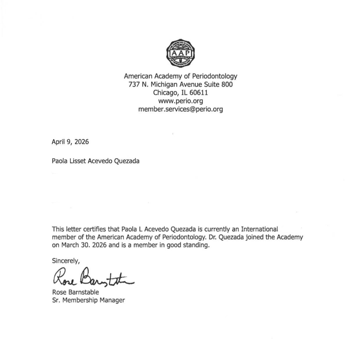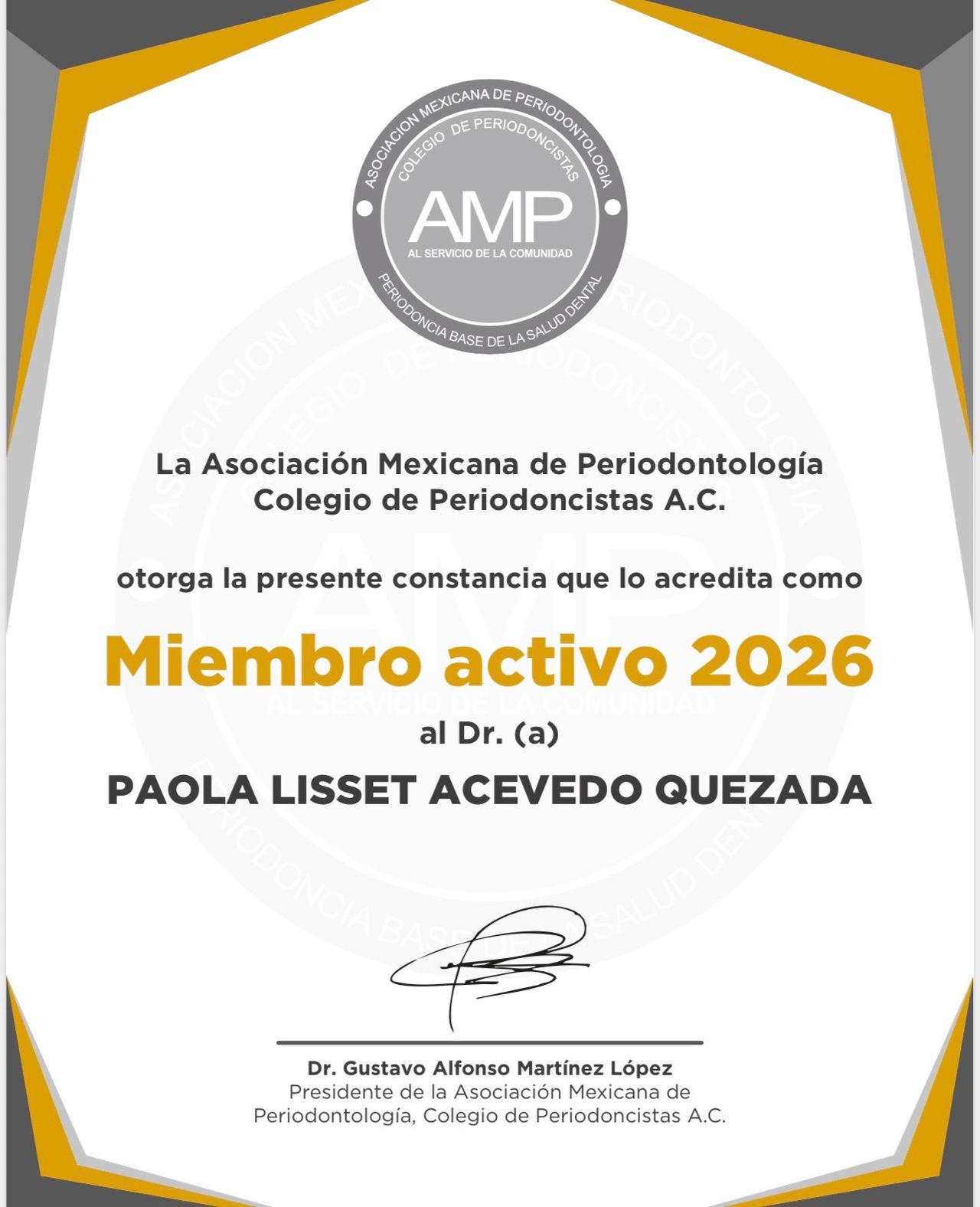 Especialista en Periodoncia e Implantología, Certificada por el Consejo Mexicano de Periodoncia.