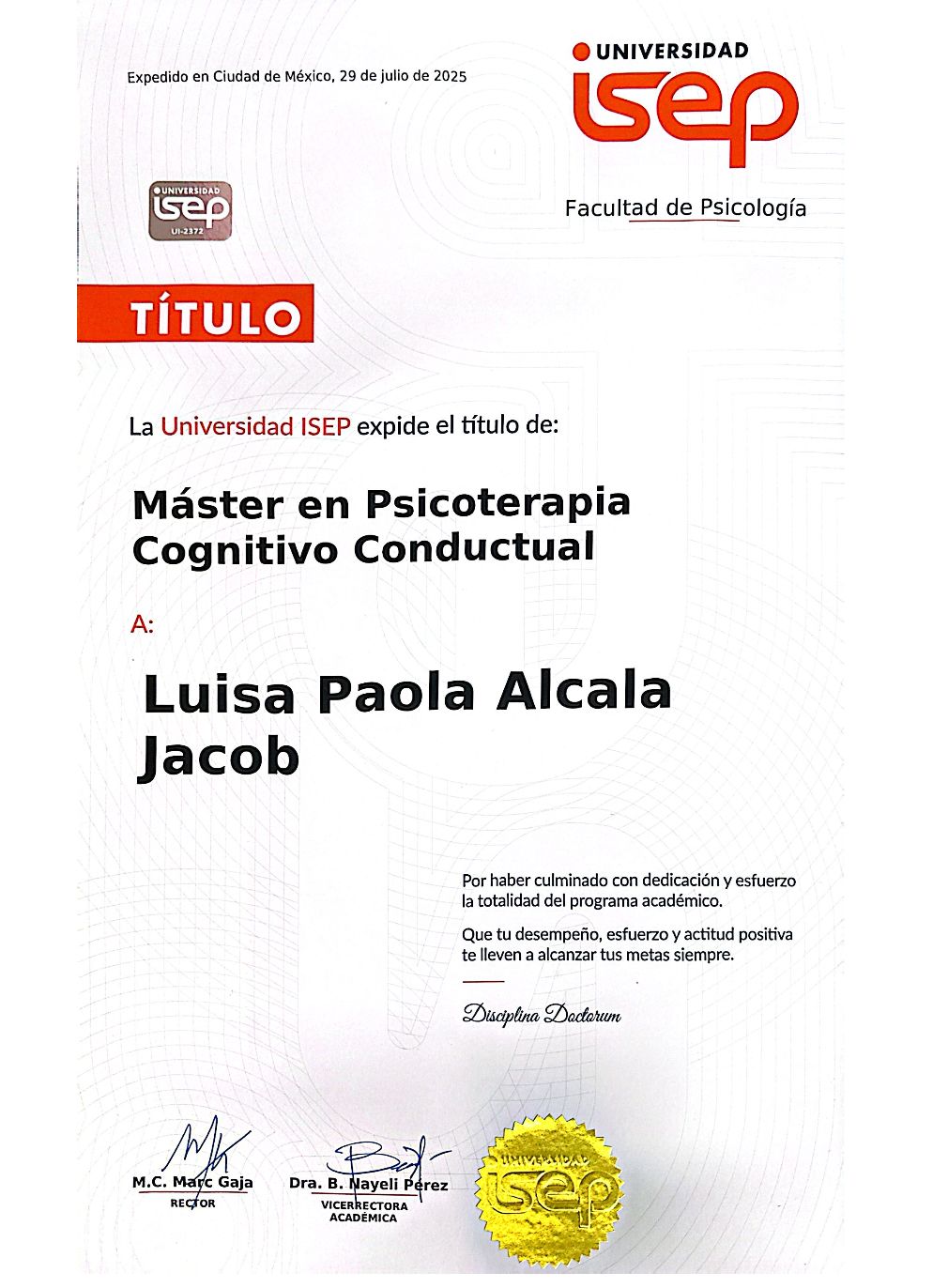 Mi formación es: Licenciatura en psicología - Universidad Iberoamericana Ciudad de México. Máster en psicoterapia Cognitivo Conductual. Diplomado en Fundamentos psicoanalíticos en la UIC. Formación en Terapia Narrativa y Terapia Centrada en Soluciones. Maestría en Psicoterapia Psicoanalítica - UIC. (cursando).