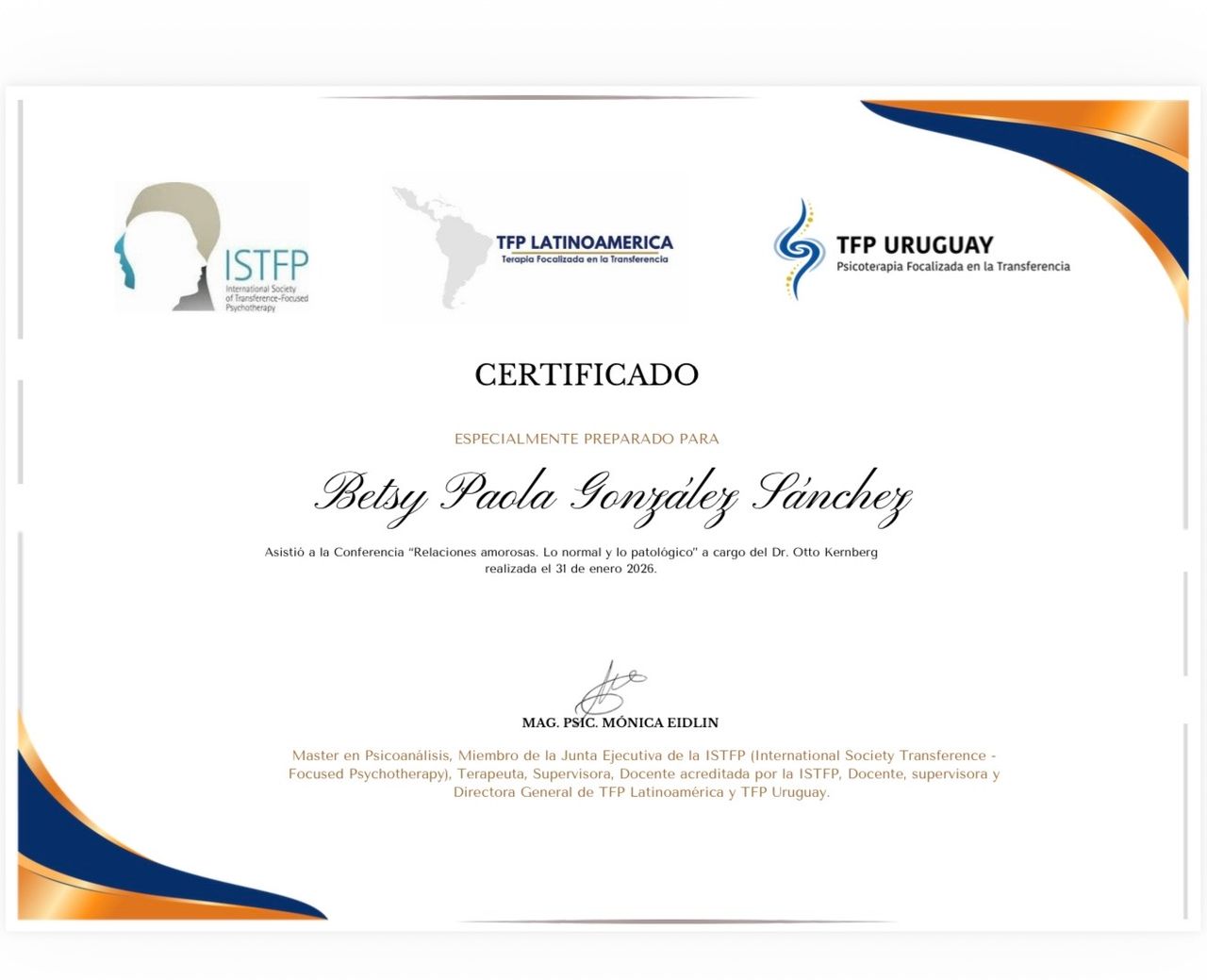 Así mismo realice un diplomado en Psicoterapia Psicoanalítica “Vida y Obra de Freud”