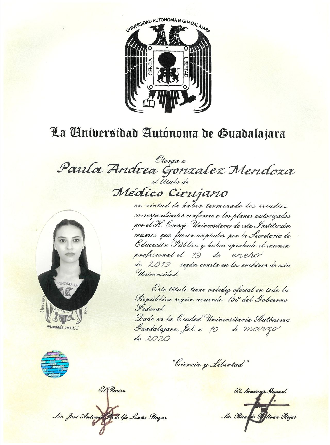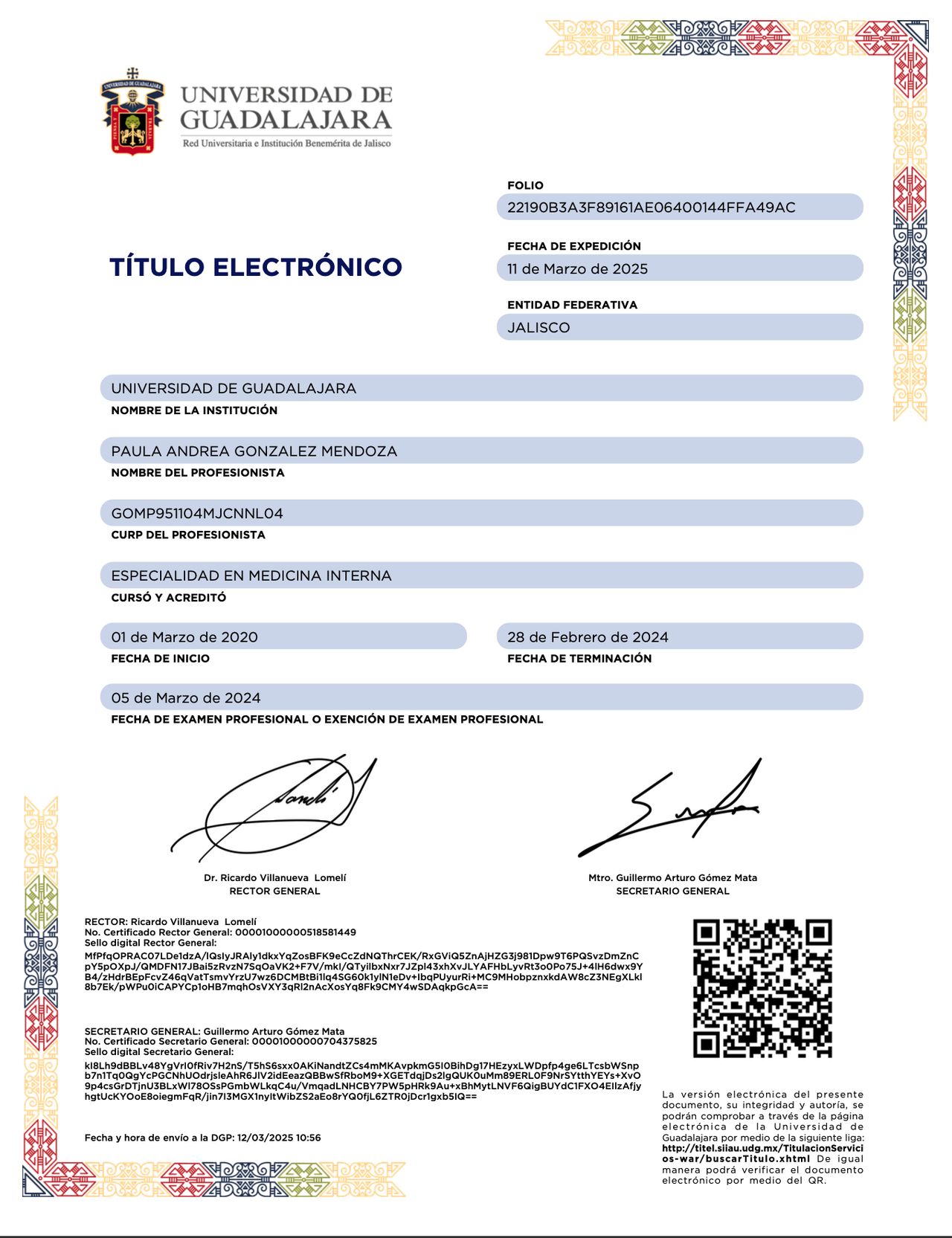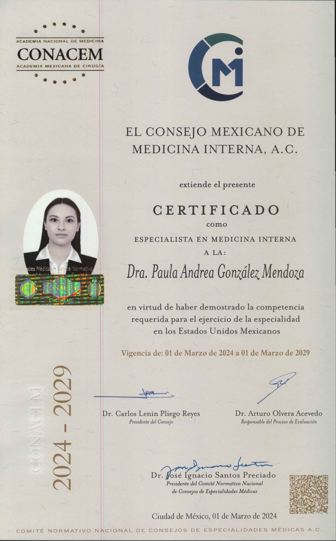 Soy la Dra. Paula Andrea, médico internista certificada por el Consejo Mexicano de Medicina Interna y miembro de la American College of Physicians. Me formé como médico general en la Universidad Autónoma de Guadalajara y realicé mi especialidad en Medicina Interna en el Hospital Angeles del Carmen, el cual forma parte de la prestigiosa red de hospitales de Grupo Ángeles, con el respaldo de la Universidad de Guadalajara.