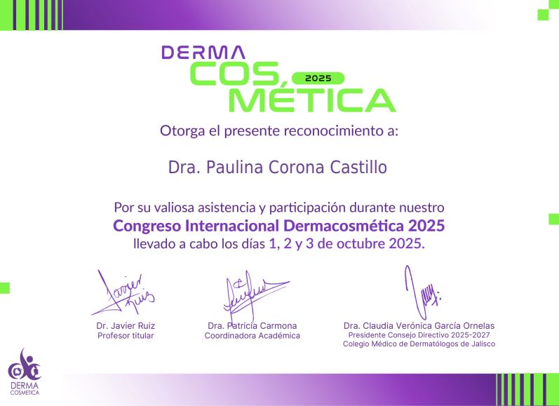 Nuestra formación se mantiene constante a través de cursos y congresos nacionales e internacionales, donde nos actualizamos sobre padecimientos, estamos a la vanguardia con el uso de tecnología láser y sobre todo nuevas terapias para tratar distintos padecimientos. También tengo una sólida formación en dermatología cosmética que abarca aplicación de bioestimuladores, toxina botulínica y uso de láser para rejuvenecimiento.
