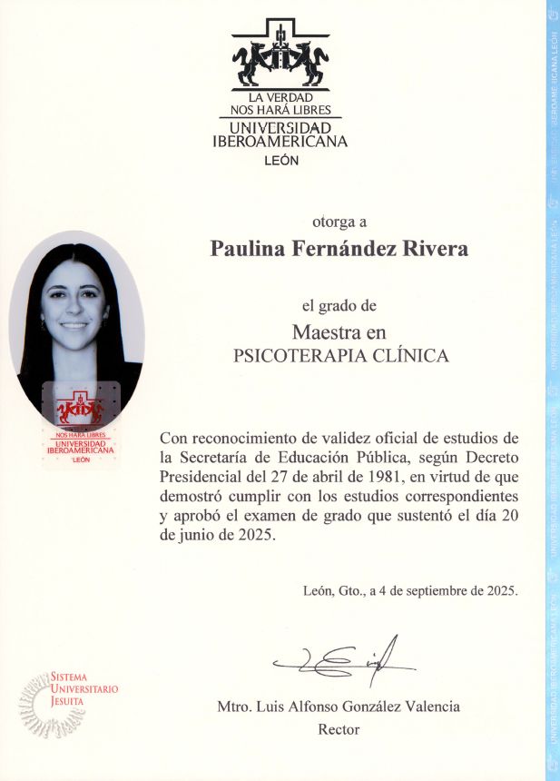Graduada como Licenciada en Psicología por medio de la Universidad Iberoamericana León y especializada en el ámbito clínico en el posgrado de Psicoterapia Clínica de la Universidad Iberoamericana León. Experiencia acompañando procesos psicoterapéuticos desde un enfoque Cognitivo Conductual atentiendo diversas problemáticas. Trabajando en el proceso de evaluación, diagnóstico y tratamiento.
