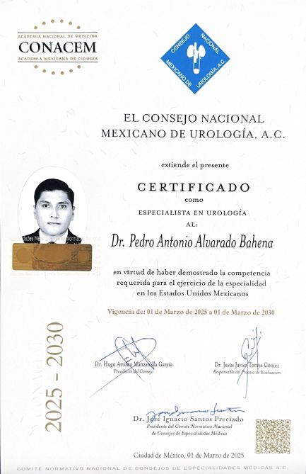 Soy el Dr. Pedro Antonio Alvarado Bahena, médico especialista en Urología egresado del Hospital General “Dr. Manuel Gea González”, institución reconocida en México por su excelencia en la formación de especialistas. Cursé una estancia formativa en la Fundación Puigvert de Barcelona, España, y una alta especialidad en Urología Oncológica en el Instituto Nacional de Cancerología, consolidando mi experiencia en el manejo integral del cáncer urológico.