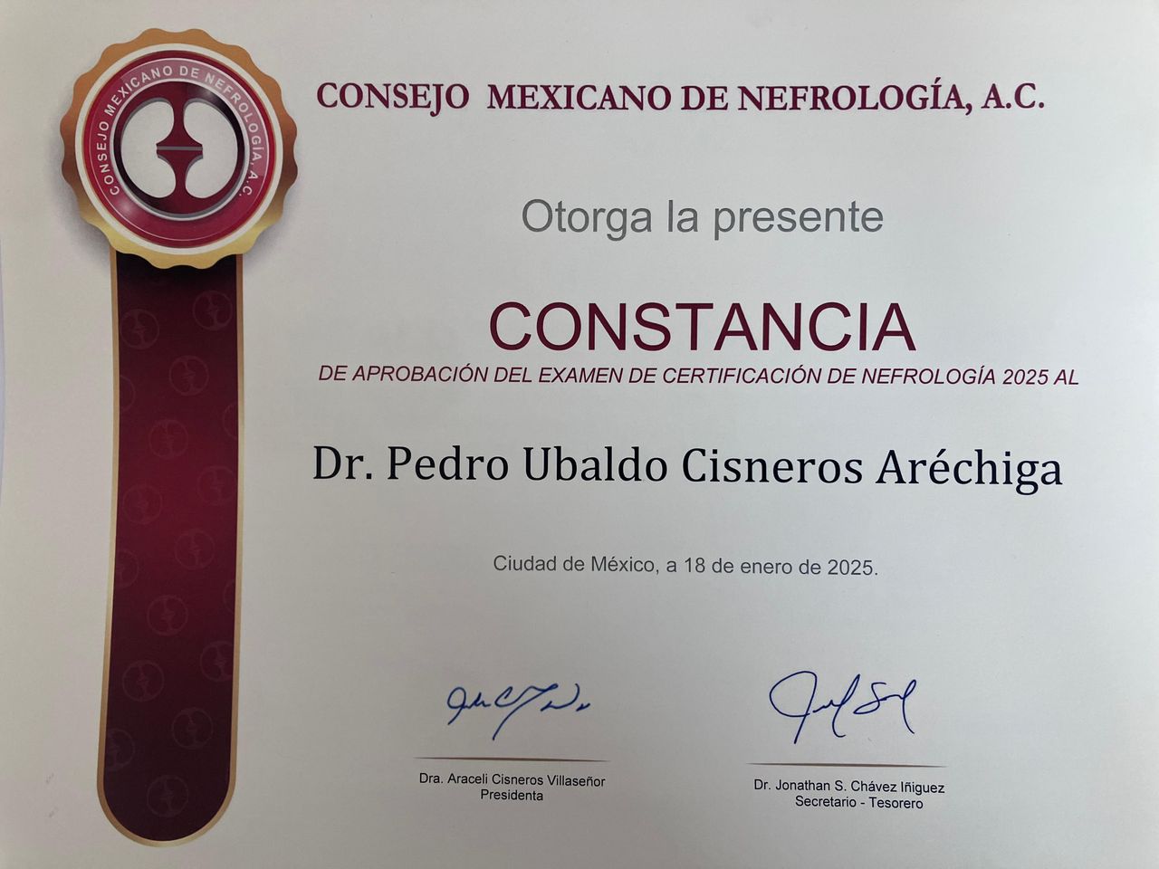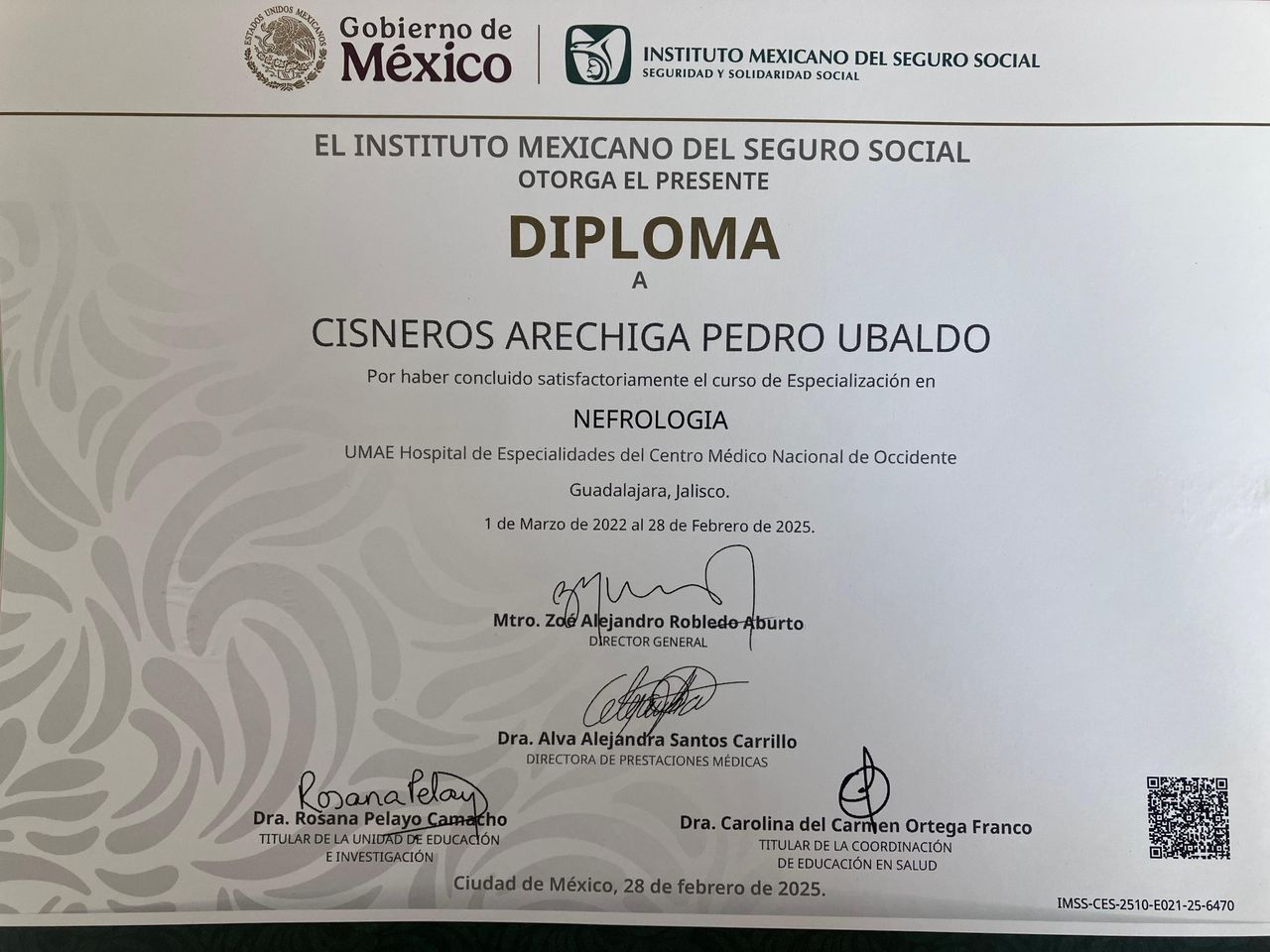 Soy médico especialista en Nefrología, certificado por el Consejo Mexicano de Nefrología. Estoy comprometido con ofrecer una atención cálida, ética y de calidad a cada paciente. Mi objetivo es mejorar tu calidad de vida mediante una evaluación, diagnóstico, tratamiento y seguimiento individualizado, explicados de forma clara y accesible. Creo en una medicina centrada en la persona, priorizando tu bienestar integral y acompañándote paso a paso durante tu proceso de salud.