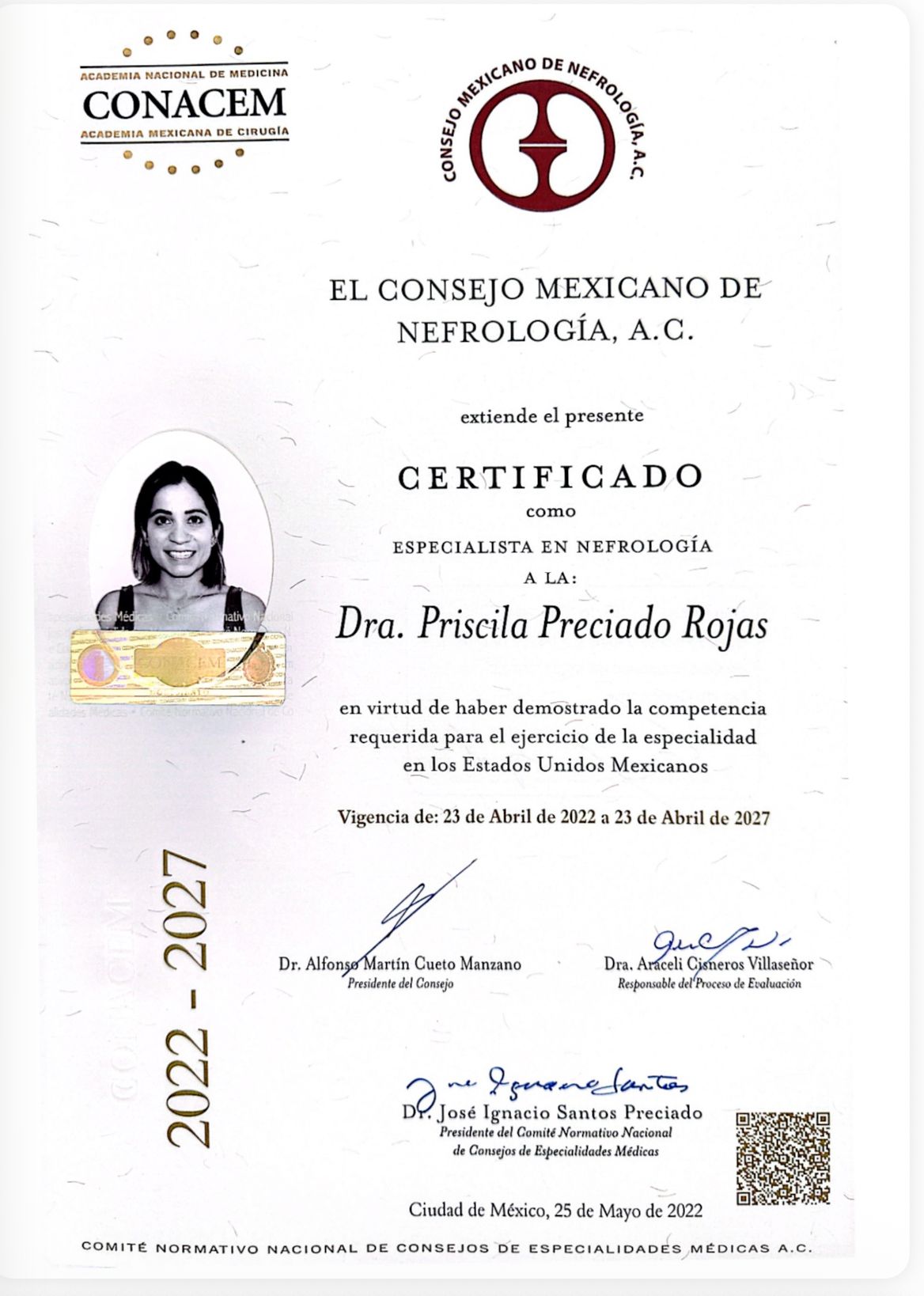 La Dra. Priscila Preciado Rojas cursó la Carrera de Medicina en la Universidad de Guadalajara para después continuar con su formación en Medicina Interna la Unidad Médica de Alta Especialidad IMSS para después completar la Sub-especialidad en Nefrología en el Hospital de Especialidades Centro Médico Nacional de Occidente en Guadalajara. La Dra. Priscila continua su formación académica con una estancia académica en investigación en el Renal Research Institute en Nueva York y la industria farmacéutica en San Diego. Al mismo tiempo completa su Doctorado en Ciencias Médicas por la Universidad de Maastricht, Holanda. Durante sus años de formación académica desarrolló habilidades en todas la areas básicas de la nefrología incluyendo infecciones, litiasis, enfermedad renal crónica y aguda, hemodiálisis, diálisis peritoneal. Está certificada por el Consejo Mexicano de Nefrología y es miembro activo de sociedades de Nefrologia Nacionales e Internacionales.