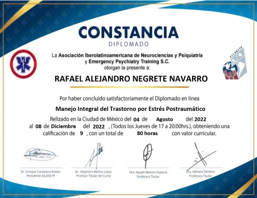 Cuento con maestría en Terapia Cognitivo Conductual (Centro de Psicoterapia Cognitiva) y diplomados en Trastorno de Estrés Postraumático y Terapia de Esquemas. Docente en la Universidad Xochicalco.