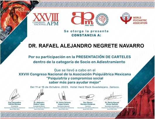 Médico psiquiatra formado en el Hospital Psiquiátrico "Fray Bernardino Álvarez" (UNAM), certificado por el Consejo Mexicano de Psiquiatría; egresado como médico cirujano de la UNAM, Campus CU.