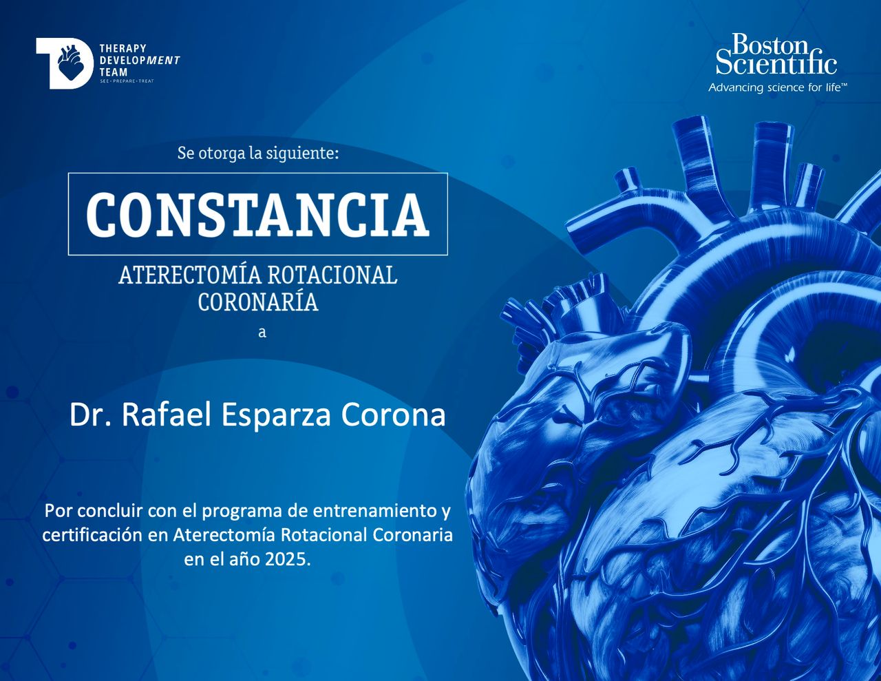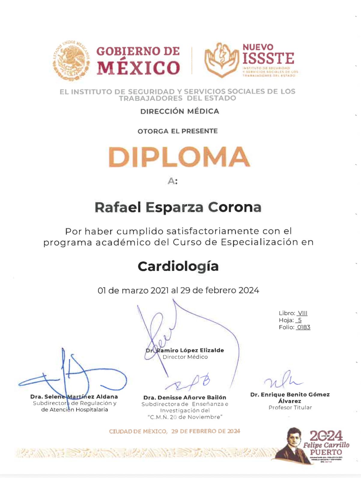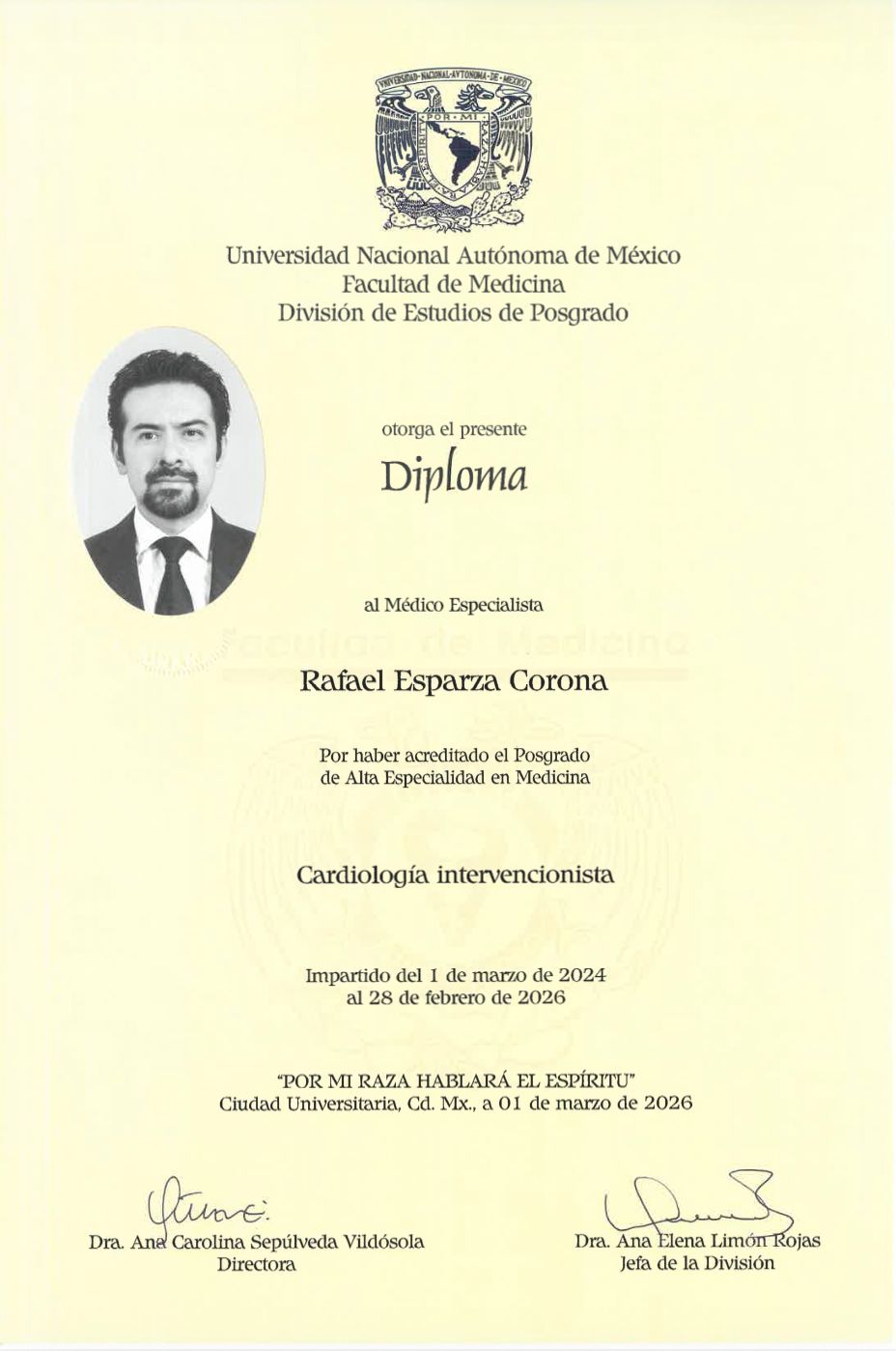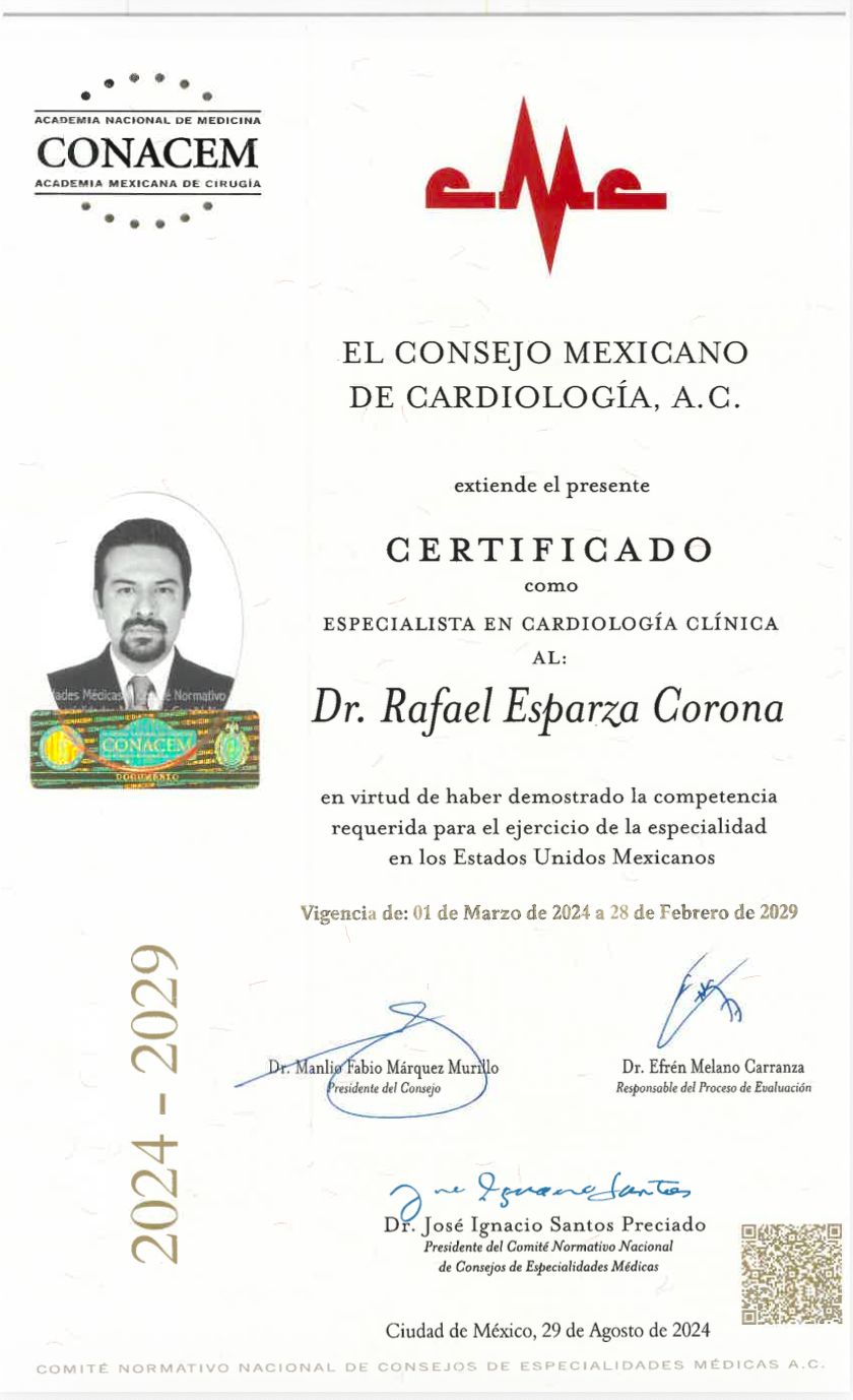 Soy el Dr Rafael Esparza Corona médico especialista. Estudié Medicina en la Universidad Autónoma de Querétaro, realicé la especialidad en Medicina Interna en la Universidad Autónoma de Nuevo León, y posteriormente me formé en Cardiología Clínica y Cardiología Intervencionista en el Centro Médico Nacional 20 de Noviembre, avalado por la Universidad Nacional Autónoma de México (UNAM).