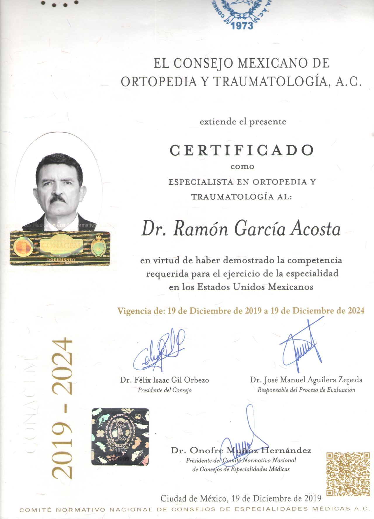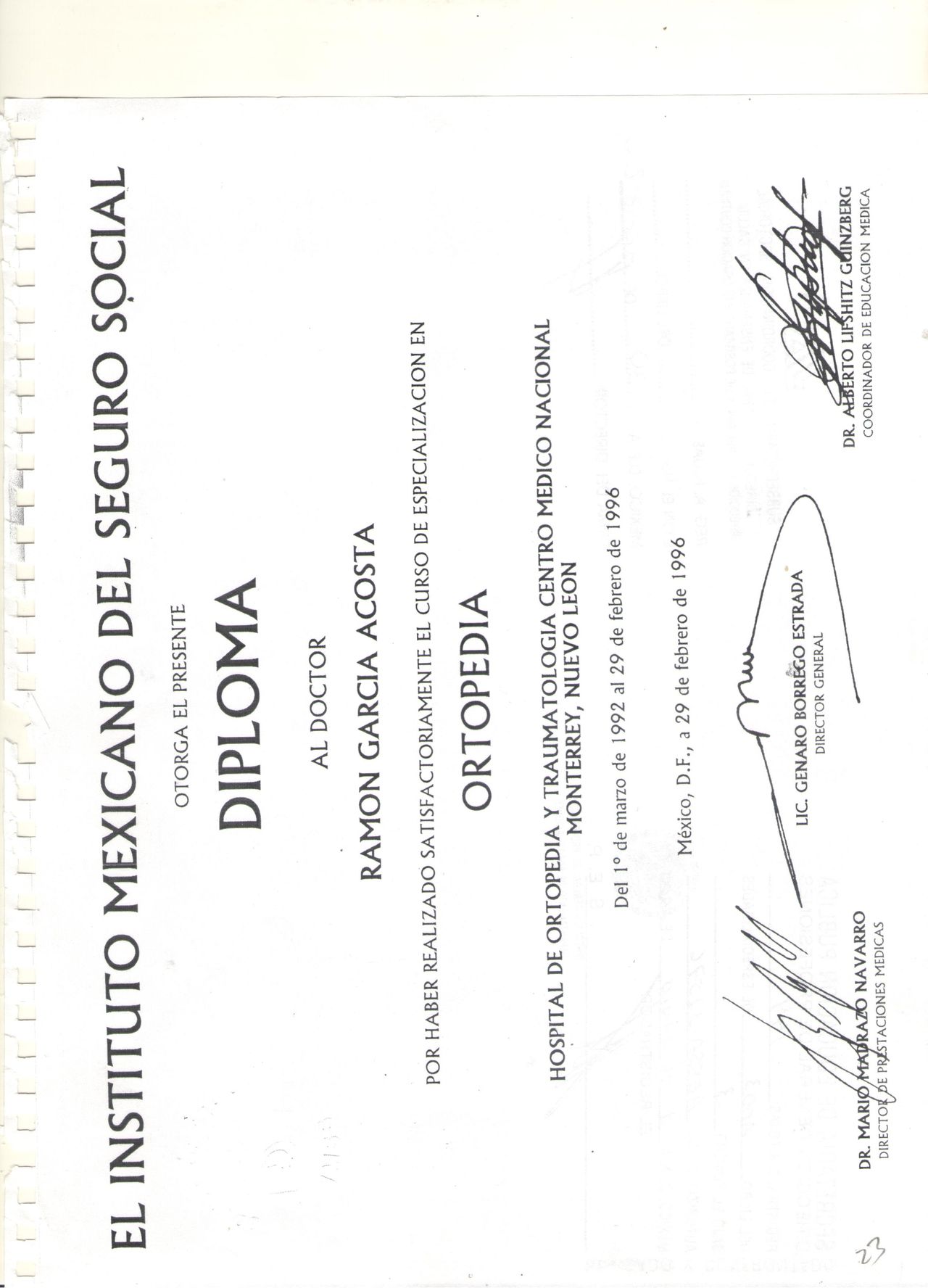 EGRESADO DE UNIVERSIDAD AUTONOMA DE NUEVO LEON ESPECIALIDAD EN ORTOPEDIA Y TRAUMATOLOGIA , SUB. ESP. EN CIRUGIA ARTICULAR Y RECONSTRUCTIVA , ARTROSCOPIA (MICROCIRUGIA ) PARA LESIONES DE MENISCOS , LIGAMENTOS ,(PLASTIA O RECONSTRUCCION DEL CRUZADO ANTERIOR) ,CONDROMALACIA , HISTORIA LABORAL INSTITUCIONAL DE 30 AÑOS HASTA JULIO DE 2024 EN EL HOSPITAL UMAE 21 DEL IMSS , 10 AÑOS EN EL MODULO DE ARTROSCOPIA , 17 AÑOS COMO PROFESOR ADJUNTO Y TITULAR DE LOS CURSOS DE PRE Y POSGRADO PARA MEDICOS ESPECIALISTAS EN FORMACION EN DEPARTAMENTO DE ARTROPLASTIA DE RODILLA ( PROTESIS ) CON APROXIMADAMENTE 160 CIRUGIAS INSTITUCIONALES AL AÑO Y UN NUMERO MENOR EN EL MEDIO PRIVADO NOS DA UN TOTAL DE 2,720 CIRUGIAS : 10% DE ESTAS FUERON PROTESIS DE REVISION Y 5% PROTESIS TUMORALES PORTADORES DE ARTRITIS REUMATOIDE O POR ANGULACIONES EXTREMAS CIRUGIA DE REVISION EN PROTESIS DE RODILLA Y CADERA FALLIDAS CON AFLOJAMIENTO POR INFECCION ( SEPTICAS) NO INFECCIOSAS (ASEPTICAS ) O POSTRAUMATICAS ( FRACTURAS PERIPROTE- SICAS ). SOLUCION A FRACTURAS COMPLEJAS