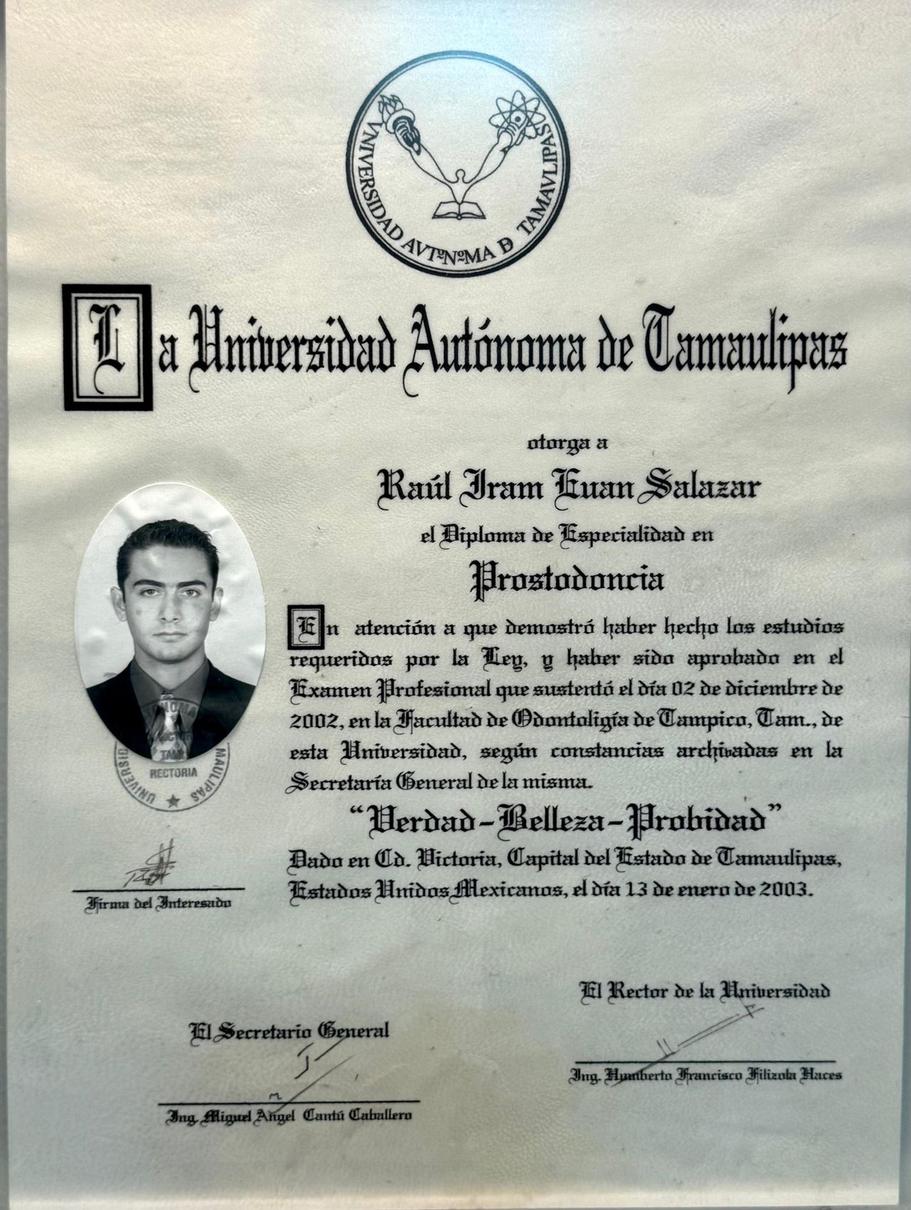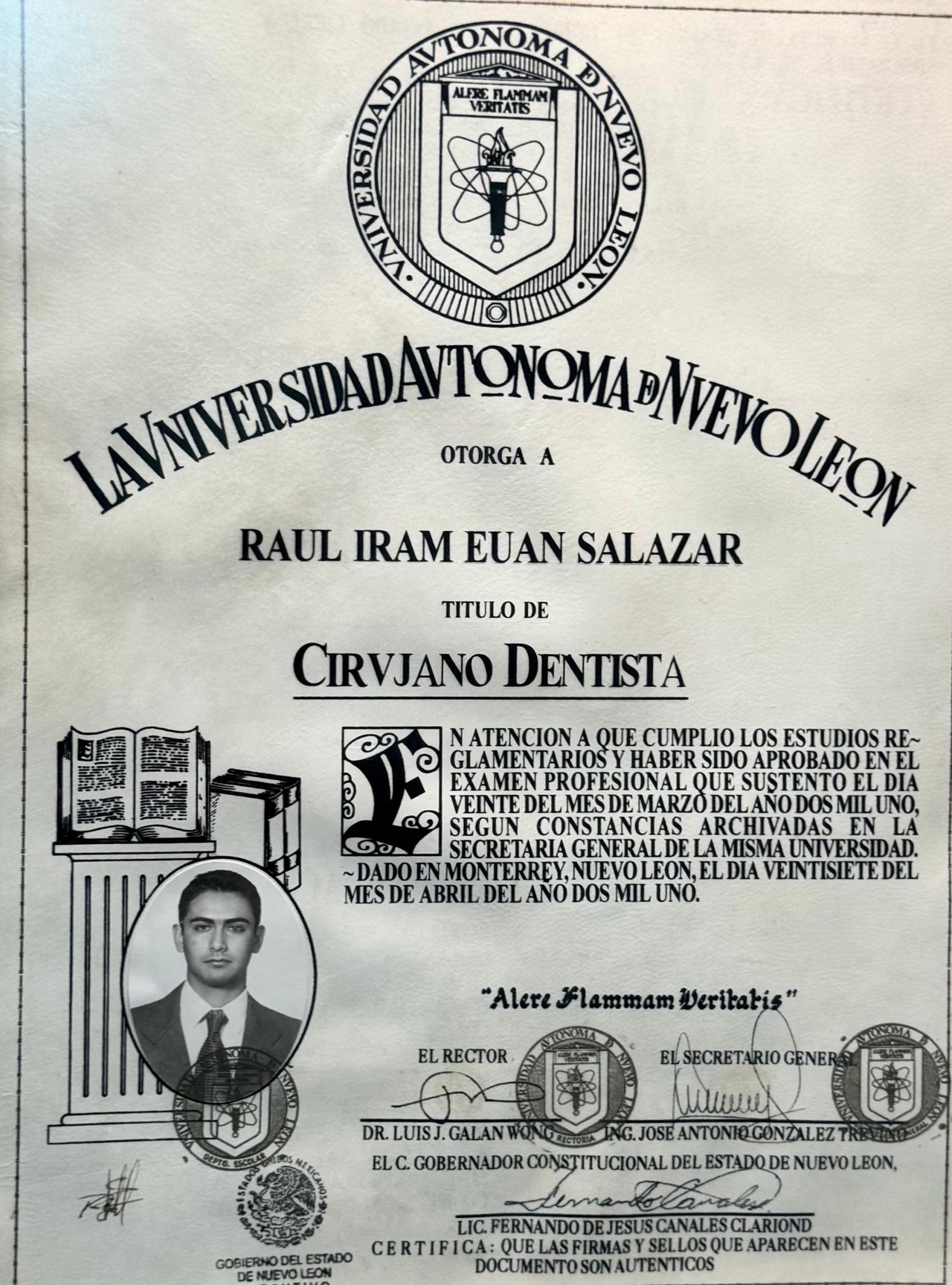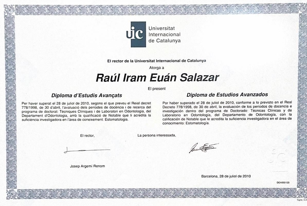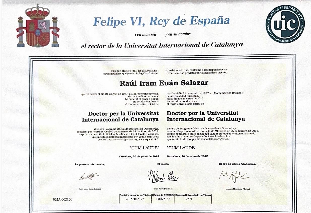 Soy Cirujano Dentista, graduado de la UANL en 1999, y Especialista en Prostodoncia y Odontología Estética de la UAT en 2002. Además, obtuve un Doctorado en Odontología de la Universidad Internacional de Catalunya, España, en 2015, y un Diploma en Estudios Avanzados en Investigación en 2010.