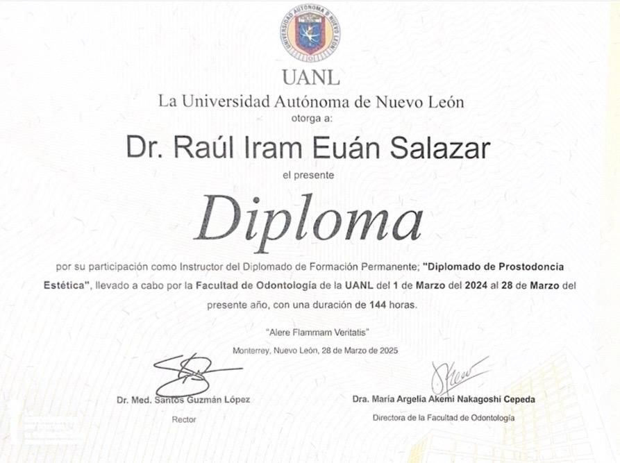 Desde 2006, soy profesor universitario, y en la actualidad tengo el honor de ser el Coordinador del Posgrado de Prostodoncia de la UANL, donde comparto mis conocimientos y experiencia con futuros odontólogos.