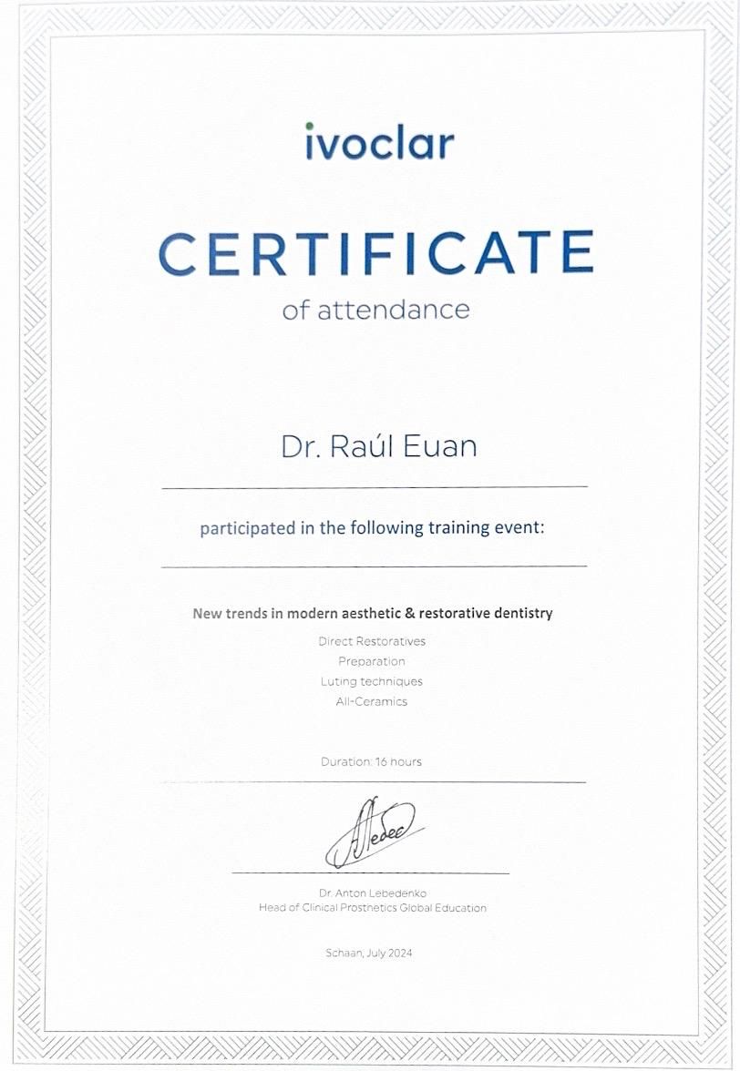 Recomiendo 100% al doctor Raúl Euán. Es un excelente profesional. Quedé completamente satisfecho con el resultado de su trabajo y la atención de todo el personal de Odontoes. 10/10