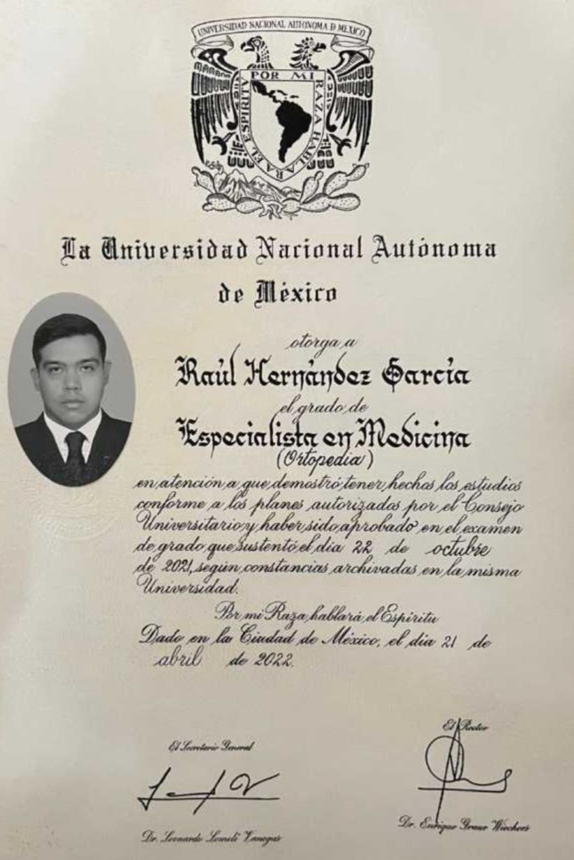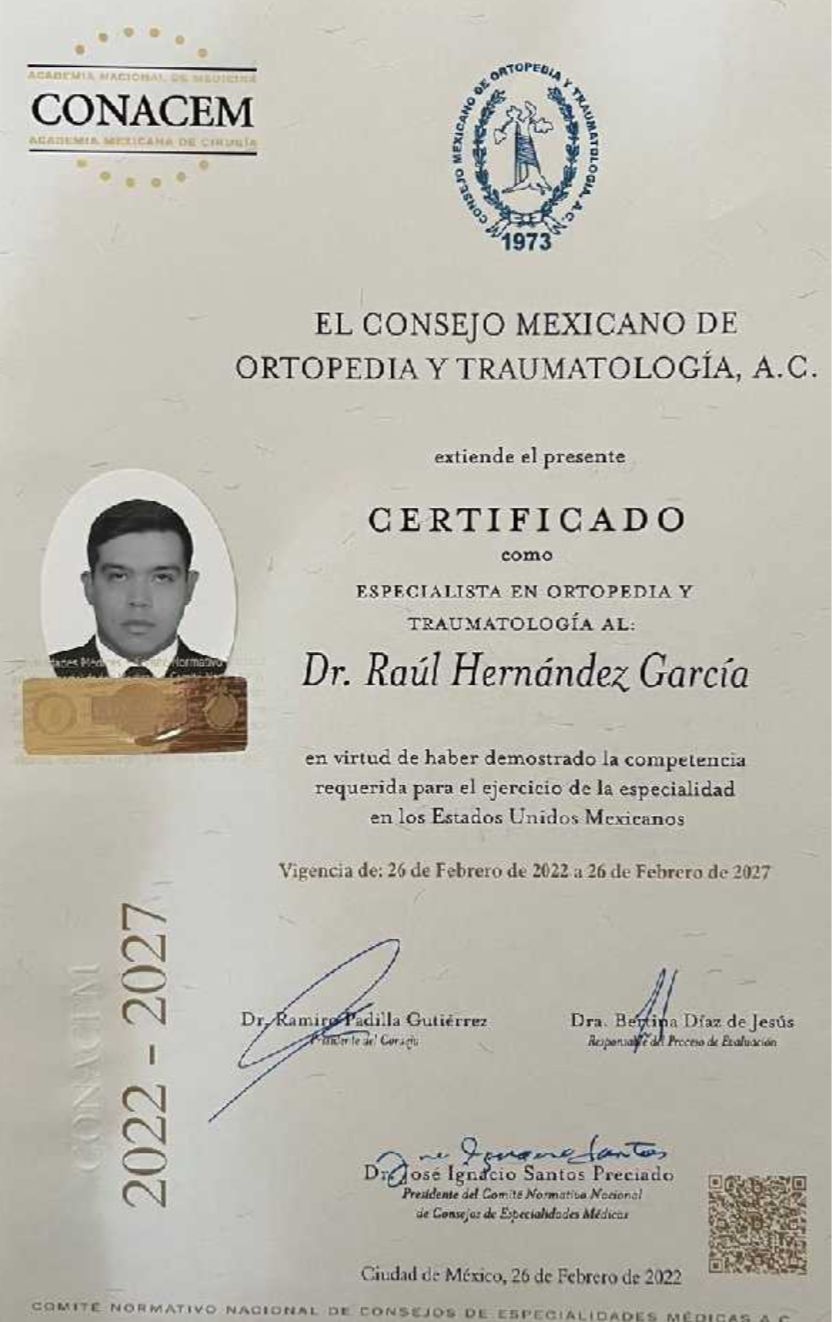 Hola, soy el Dr Raúl Hernández médico especialista en traumatología y ortopedia, con formación académica en la Ciudad de México, en un hospital de tercer nivel en donde se veían pacientes de todo el país, lo cual facilita el diagnóstico y tratamiento de los pacientes, ya que se puede encontrar desde lo más fácil o sencillo hasta casos de complejidad funcional o pérdida de la extremidad. Asegurándome de poder realizar el mejor tratamiento y entendimiento de tu enfermedad, para poder continuar juntos por un camino libre de dolor.