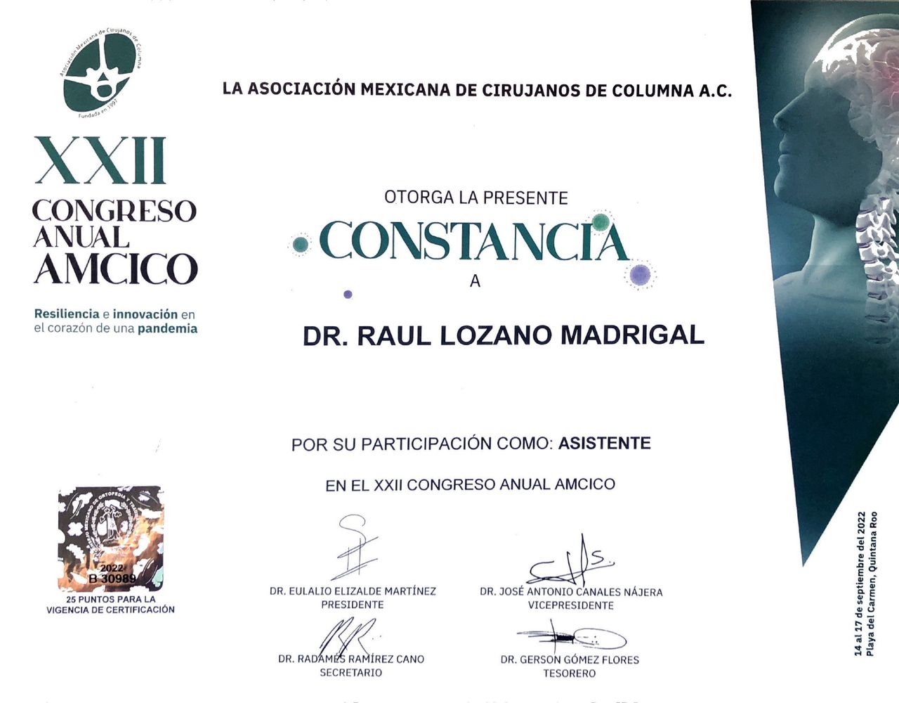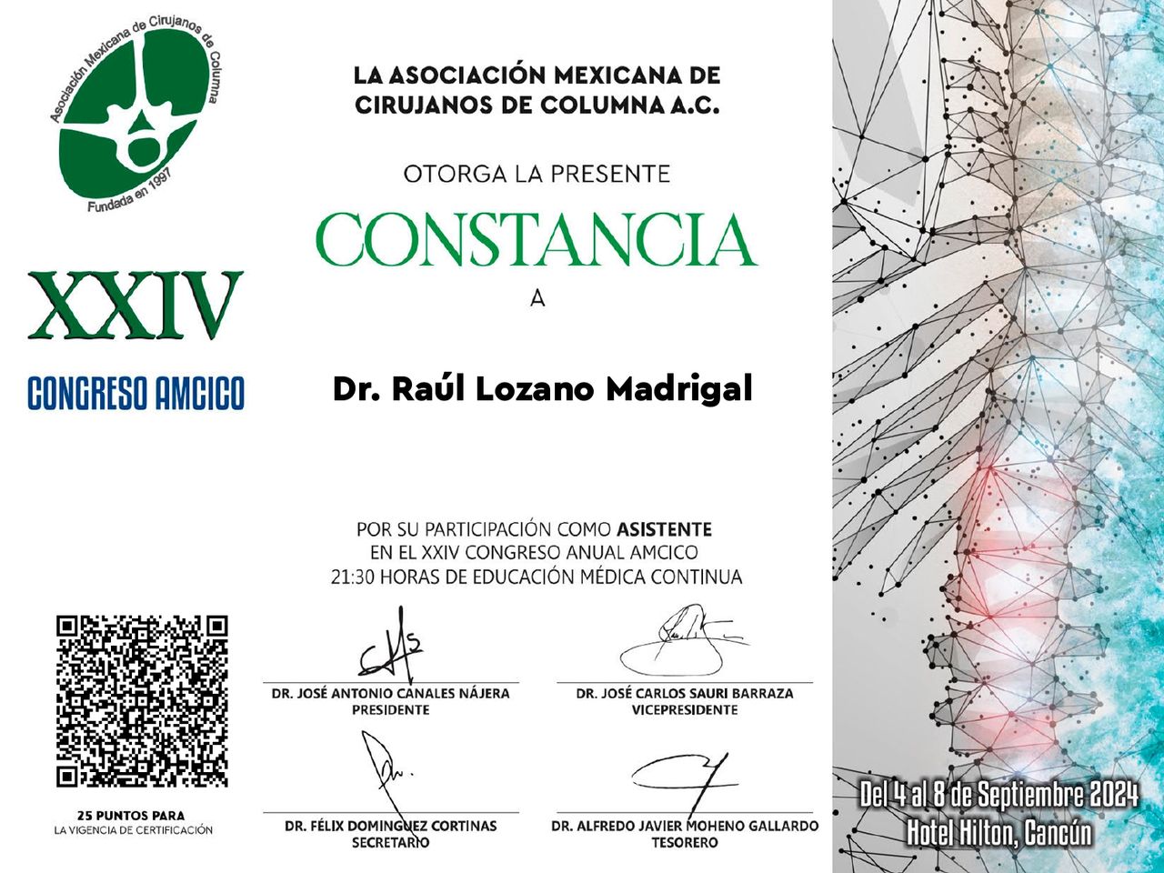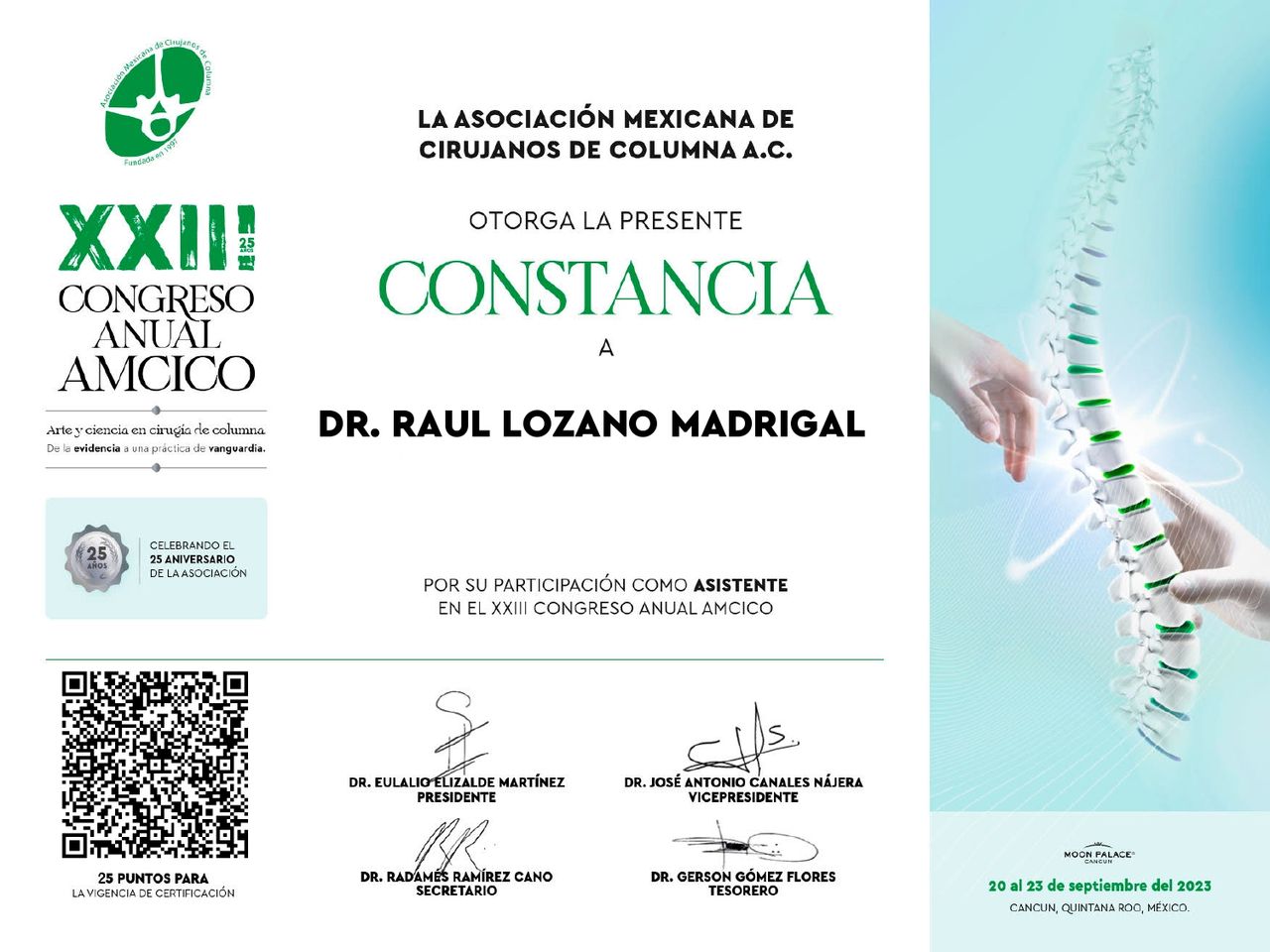 Médico Especialista en Ortopedia con Alta Especialidad en Columna Vertebral. Máster por la Sociedad Española de Columna Vertebral (GEER). Subespecialización en Mínima Invasión y Microcirugía de Columna en Humanitas Research Hospital en Milán, Italia