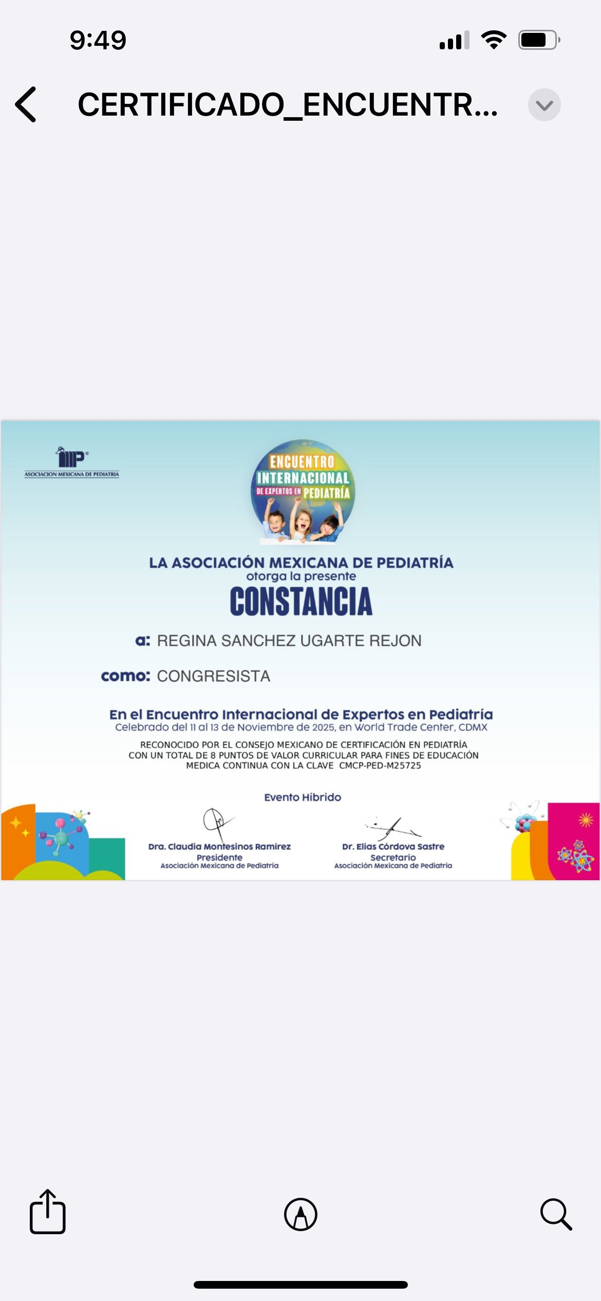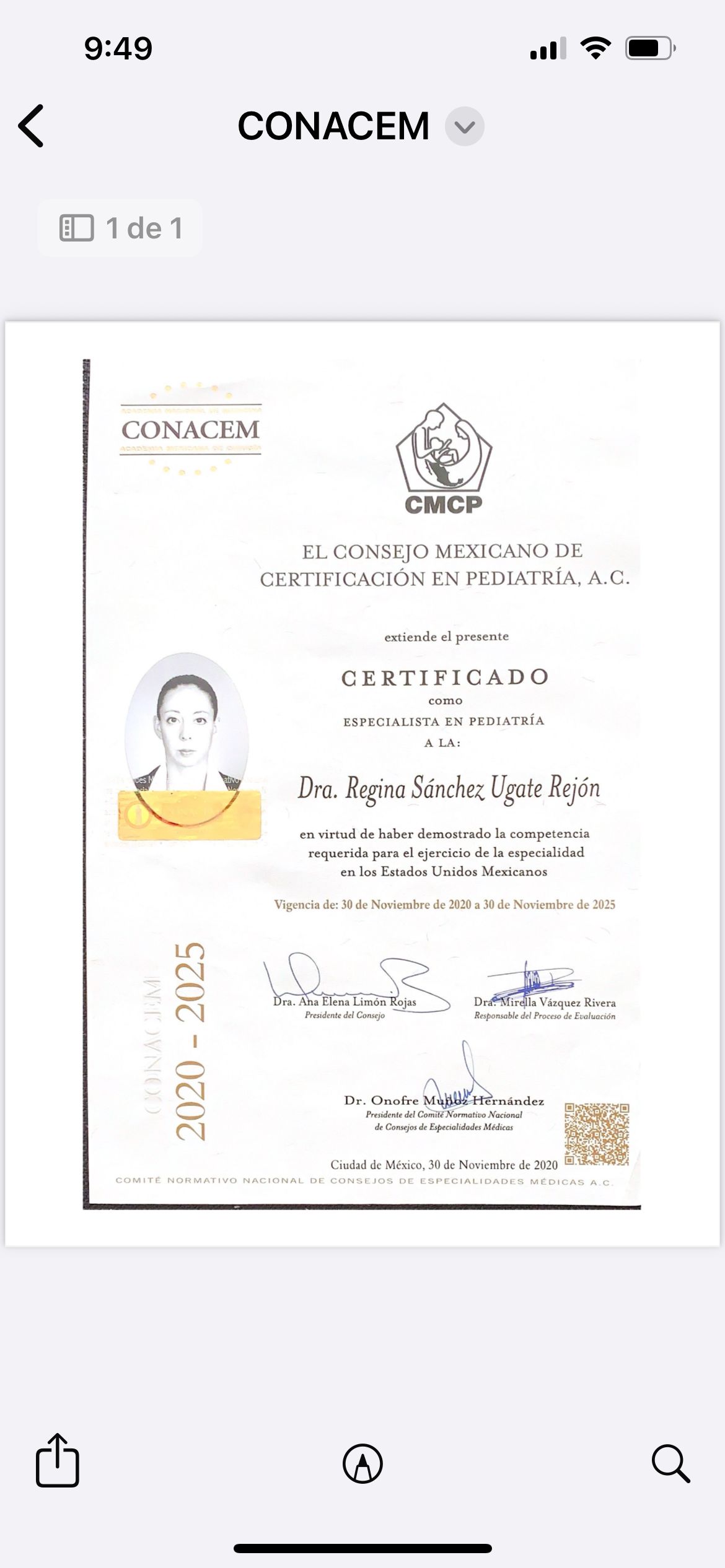 Certificación en Pediatría para ofrecer un cuidado más especializado.