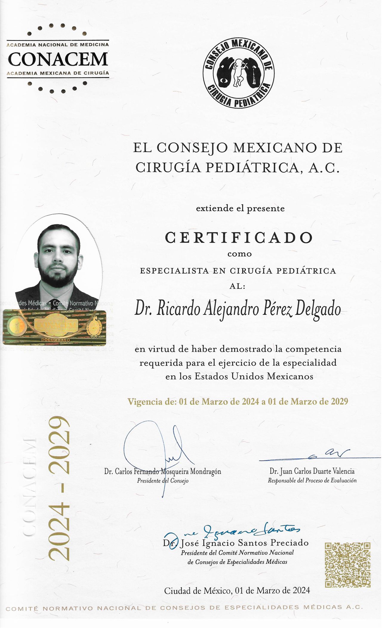 Estoy certificado por el Consejo Mexicano de Cirugía Pediátrica y el Consejo Mexicano de Certificación en Pediatría. Adicionalmente, cuento con un Posgrado de Alta Especialidad en Cirugía de Mínima Invasión Pediátrica, siendo esto una parte crucial de mi labor, para otorgar resultados de calidad con incisiones más pequeñas y un menor tiempo de recuperación según la enfermedad o el proceso a tratar de tu pequeño/a lo permitan.
