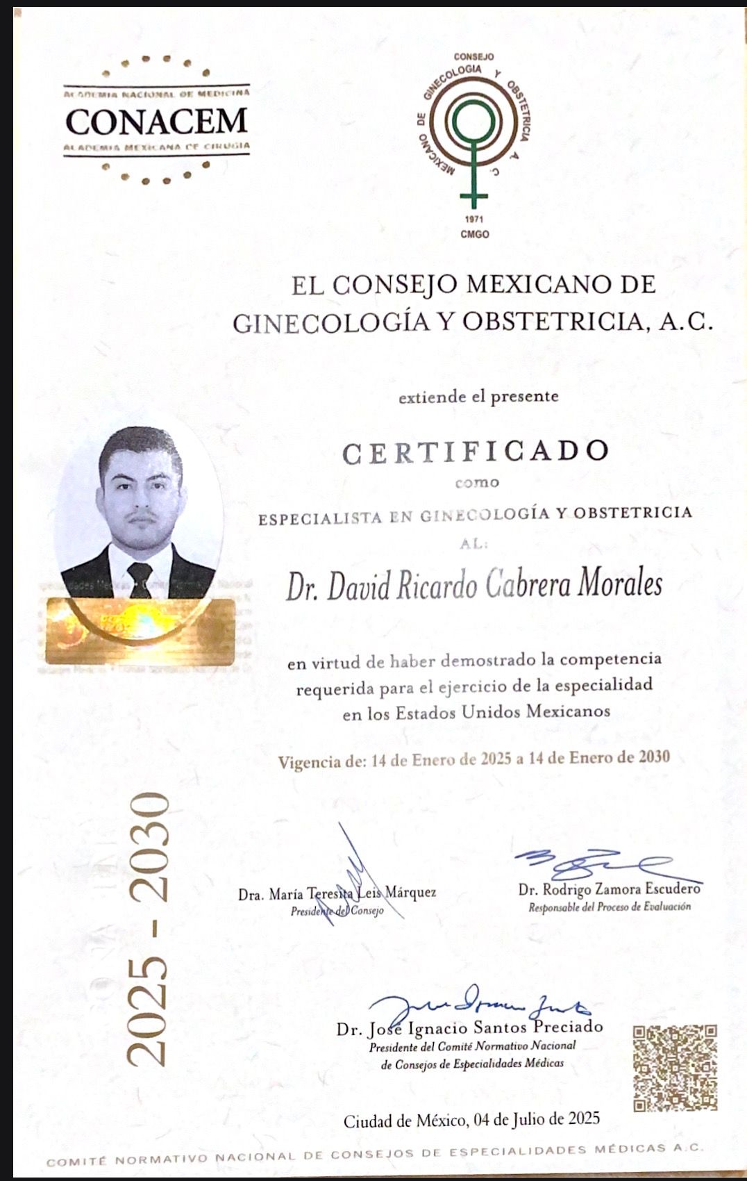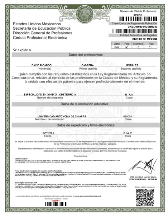 Soy médico especialista en Ginecología y Obstetricia con cédula de especialista 15031611, certificado por el Consejo Mexicano de Ginecología y Obstetricia #15534, con amplia experiencia, preparación y empatía con enfoque humano, médico en patología relacionada con la mujer en sus distintas etapas de vida, es un gusto poder brindar apoyo y solución con base en la ética y el profesionalismo.
