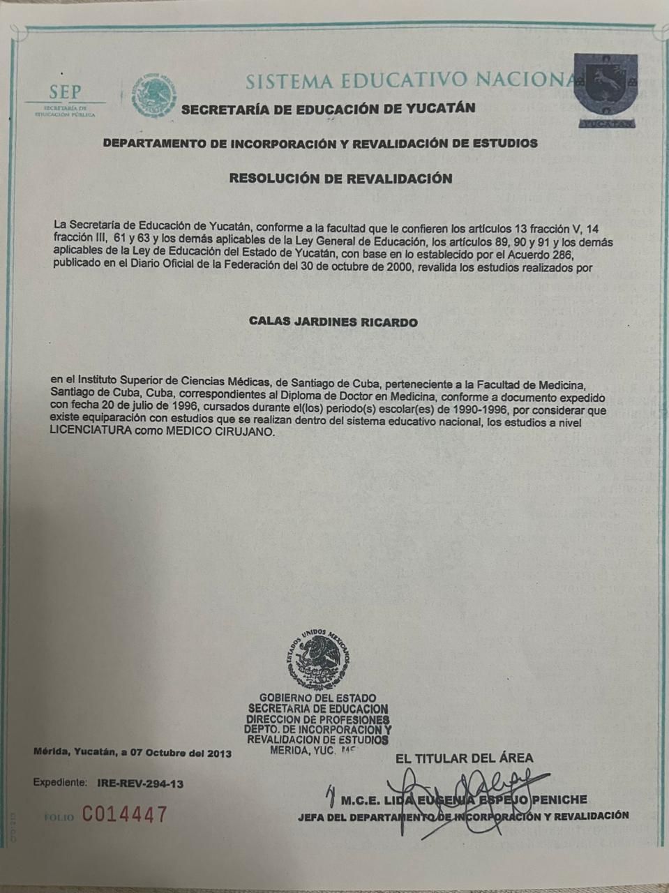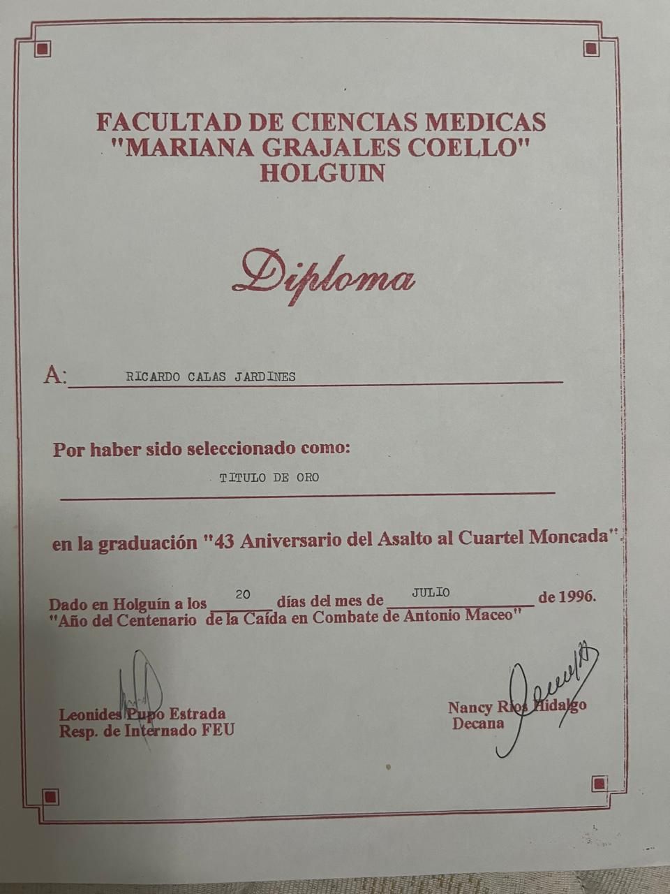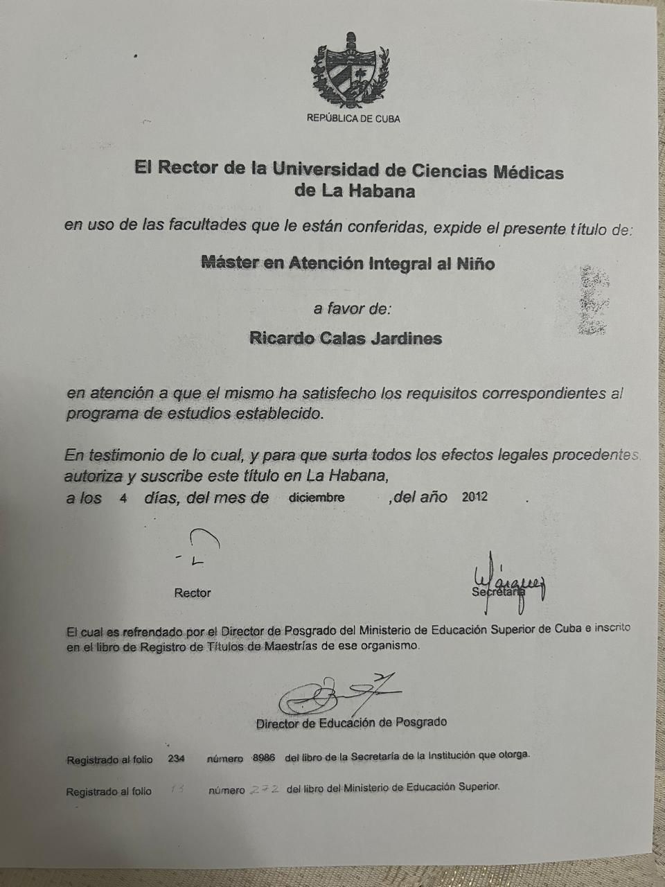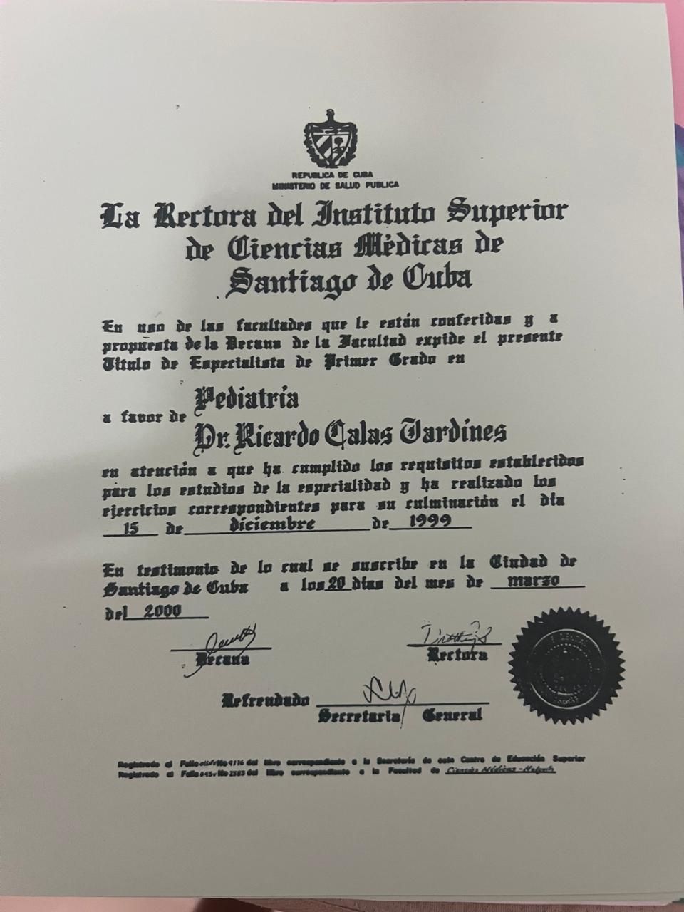 Hola un placer , gracias por acceder a mi perfil ,soy el Dr. Ricardo Calas Jardines, desde el cuarto año de la carrera de medicina me vinculé como alumno ayudante de la especialidad de Pediatría y desde entonces me complace y honra contribuir a la salud de nuestros pequeños . Una breve síntesis de mi carrera profesional: