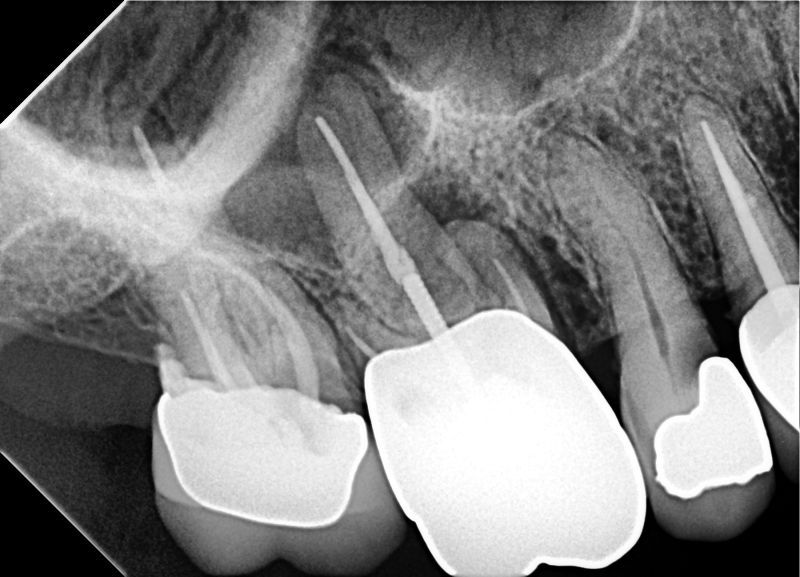 Casos como la siguiente radiografía no permitía un diagnostico acertado, los signos clínicos y síntomas del paciente no eran claros. Se decidió enviar un estudio tomográfico dental (CBCT) donde se logro localizar una Lesión de gran amplitud, provocada por una infección, localizada alrededor de las raíces del Primer molar y una fractura en la furca (zona de unión de las raíces) con compromiso oseó.