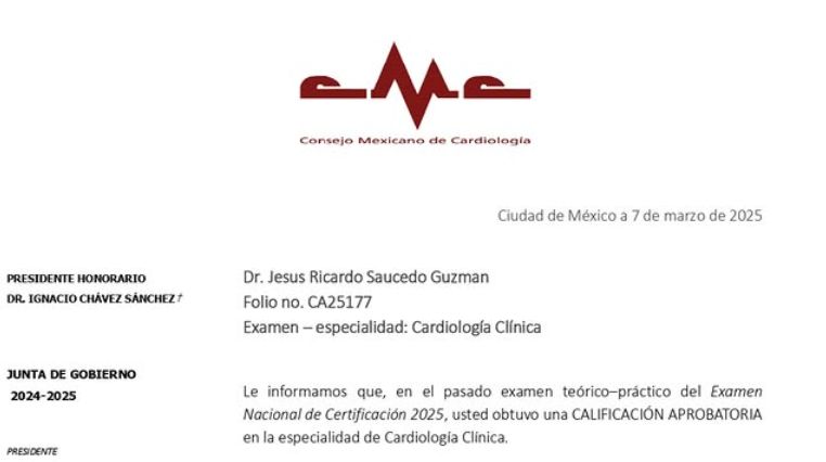 Me formé como cardiólogo en el Centro Médico Nacional de Occidente (IMSS, Guadalajara, Jalisco) durante el periodo 2022–2025, y estoy certificado por el Consejo Mexicano de Cardiología A.C. como especialista en Cardiología Clínica (vigencia 2025–2030).