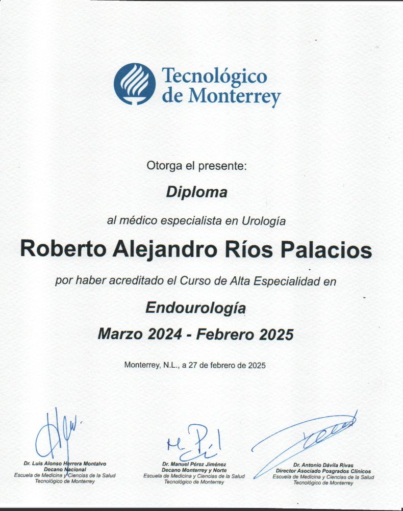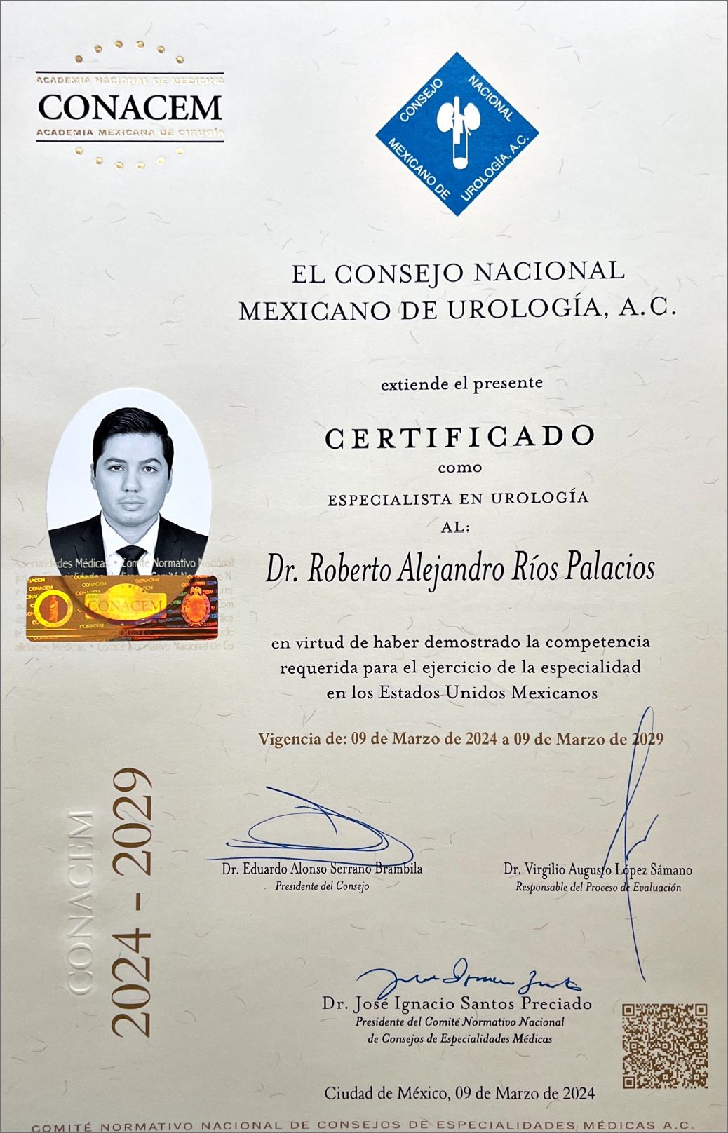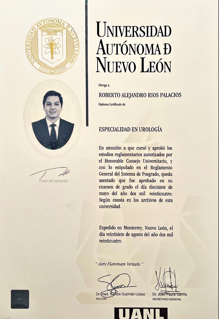 Hola, soy el Dr. Roberto Ríos, soy urólogo certificado por el Consejo Nacional Mexicano de Urología, cuento con alta especialidad en endourología y cirugía robótica. Estoy a tus ordenes para atenderte y juntos encontrar la mejor alternativa para tu problema urológico.