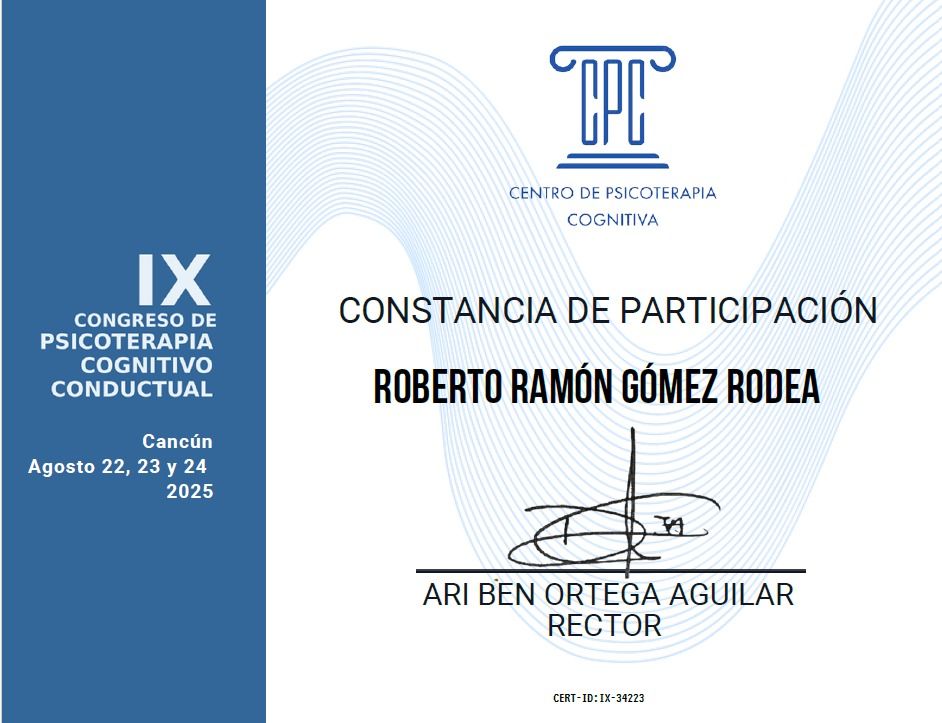 El Psicólogo Roberto Ramón Gómez Rodea, es un profesional de la salud, excepcional y competente. Sabe crear para sus pacientes un ambiente seguro y de confianza. Gracias a su apoyo, se crea una guía de herramientas prácticas con la que se aprende a manejar mejor las emociones.