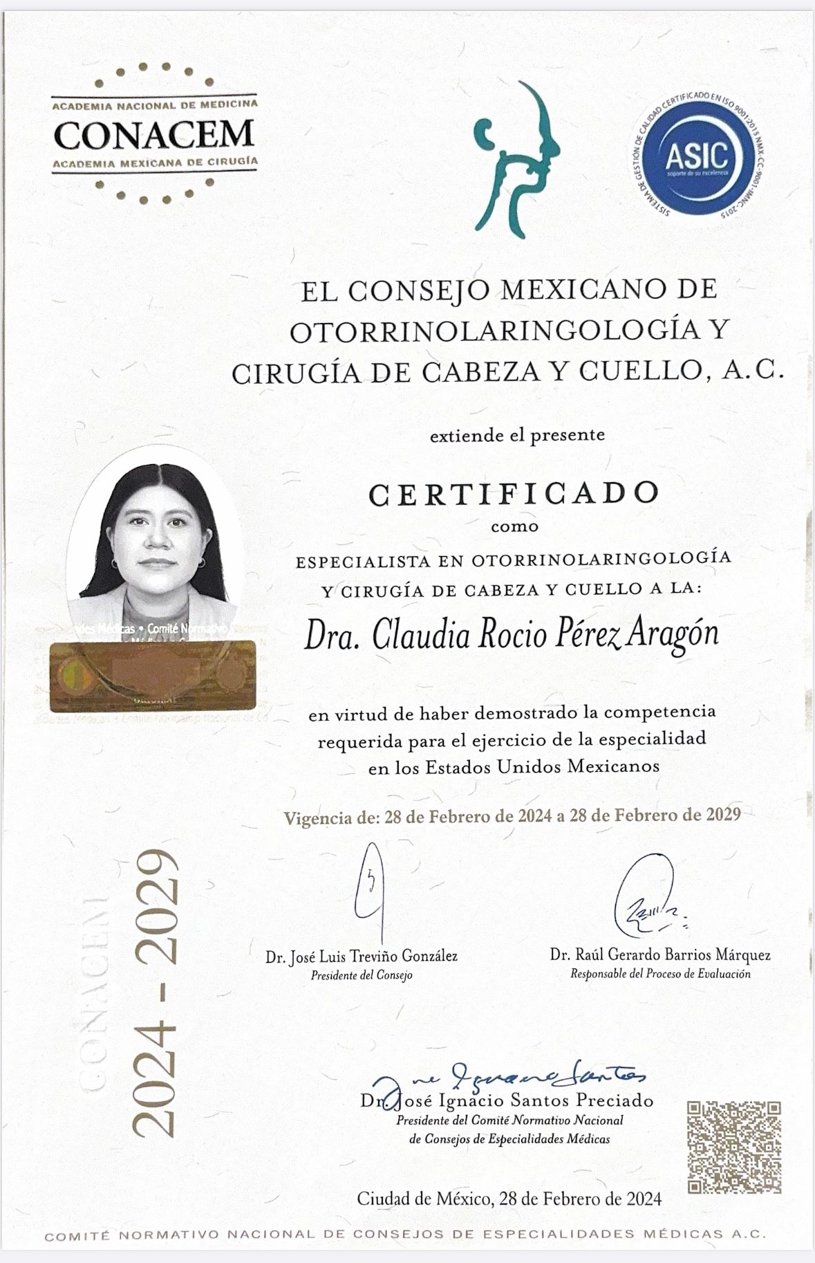 * Certificada por el Consejo Mexicano de Otorrinolaringología.