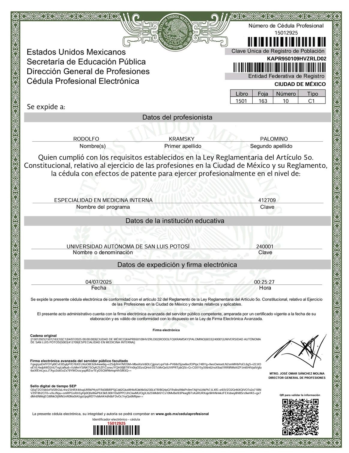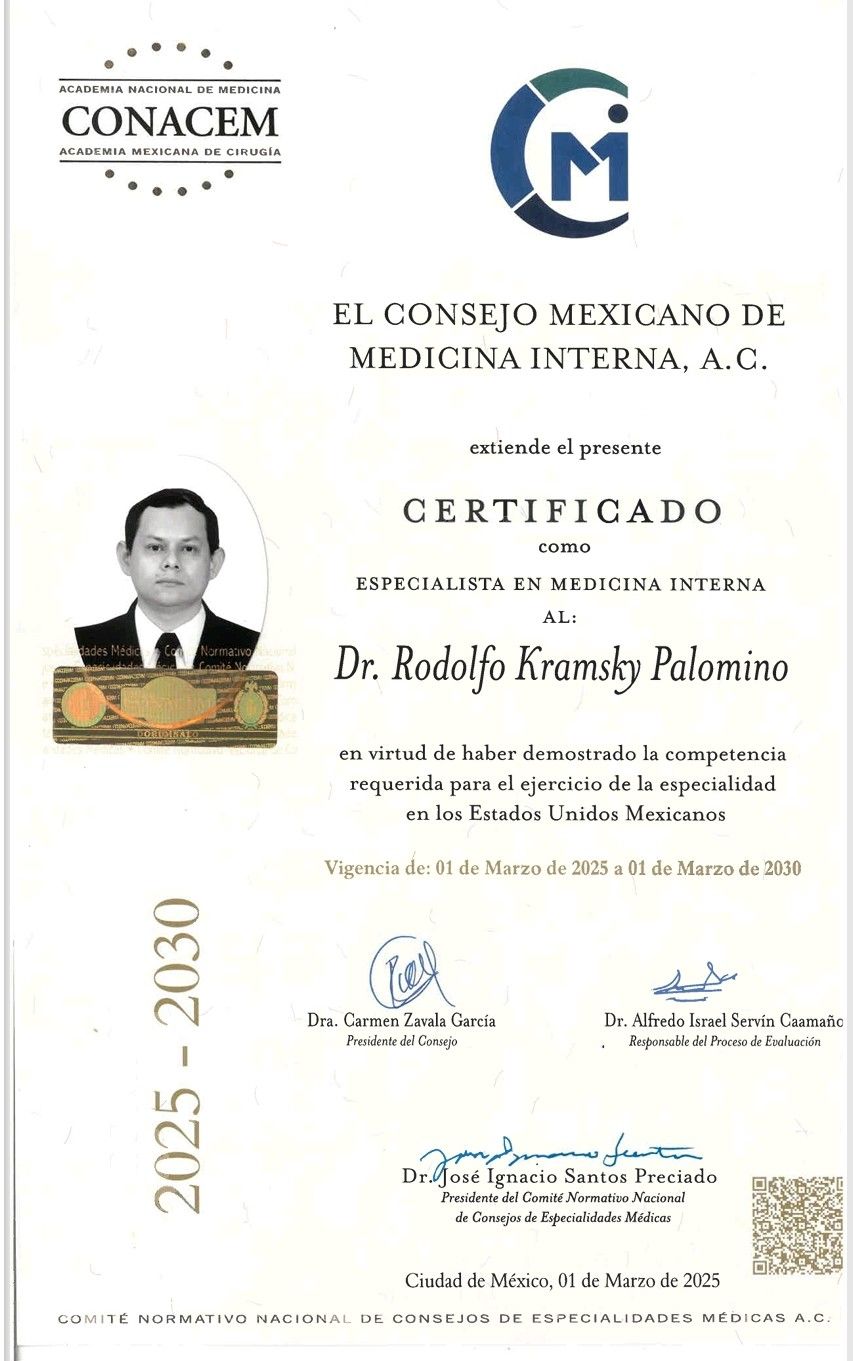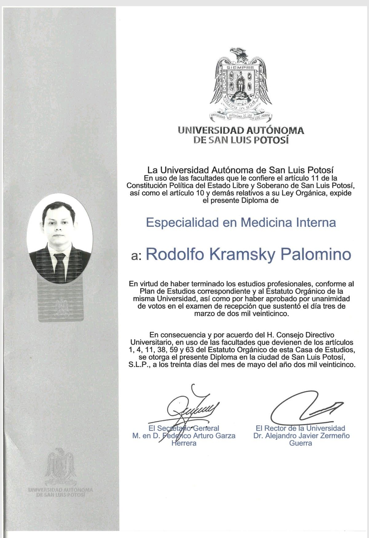 ¡Hola! Soy el Dr. Rodolfo Kramsky Palomino " Médico Internista" en Monterrey Nuevo León. Especializado en la atención integral del adulto, con formación avalada por la Universidad Autónoma de San Luis Potosí, certificado por el Consejo Mexicano de Medicina Interna.