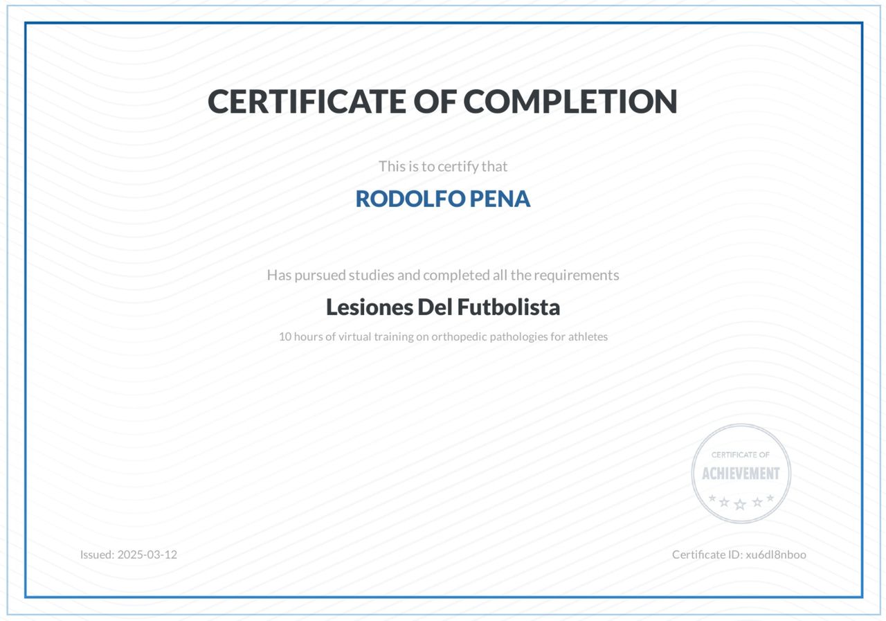 Fellow de la Clínica CEMTRO Madrid (Centro de excelencia FIFA) , bajo la tutela del Maestro Pedro Guillen, donde se perfeccionan las habilidades en cirugía deportiva, y artroscopia.