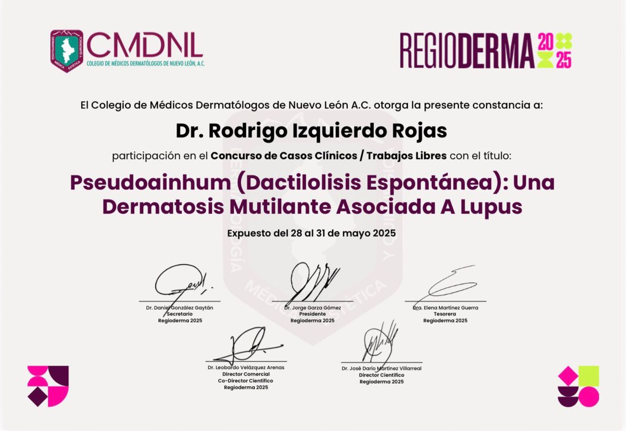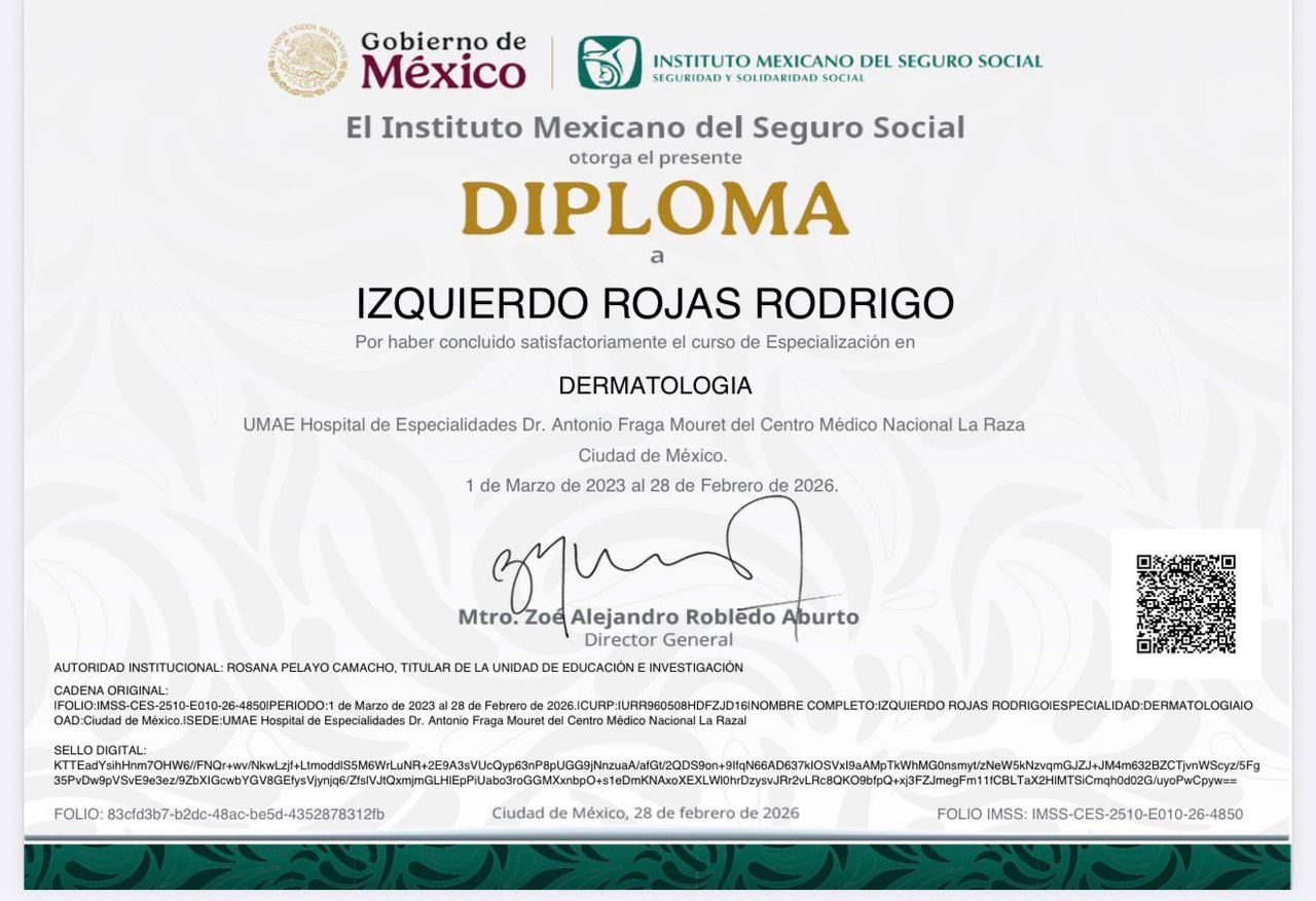 Hola, soy médico especialista en dermatología, graduado del Centro Médico Nacional "La Raza". Cuento con experiencia en el diagnóstico y tratamiento de diversas enfermedades de la piel, el cabello y las uñas.