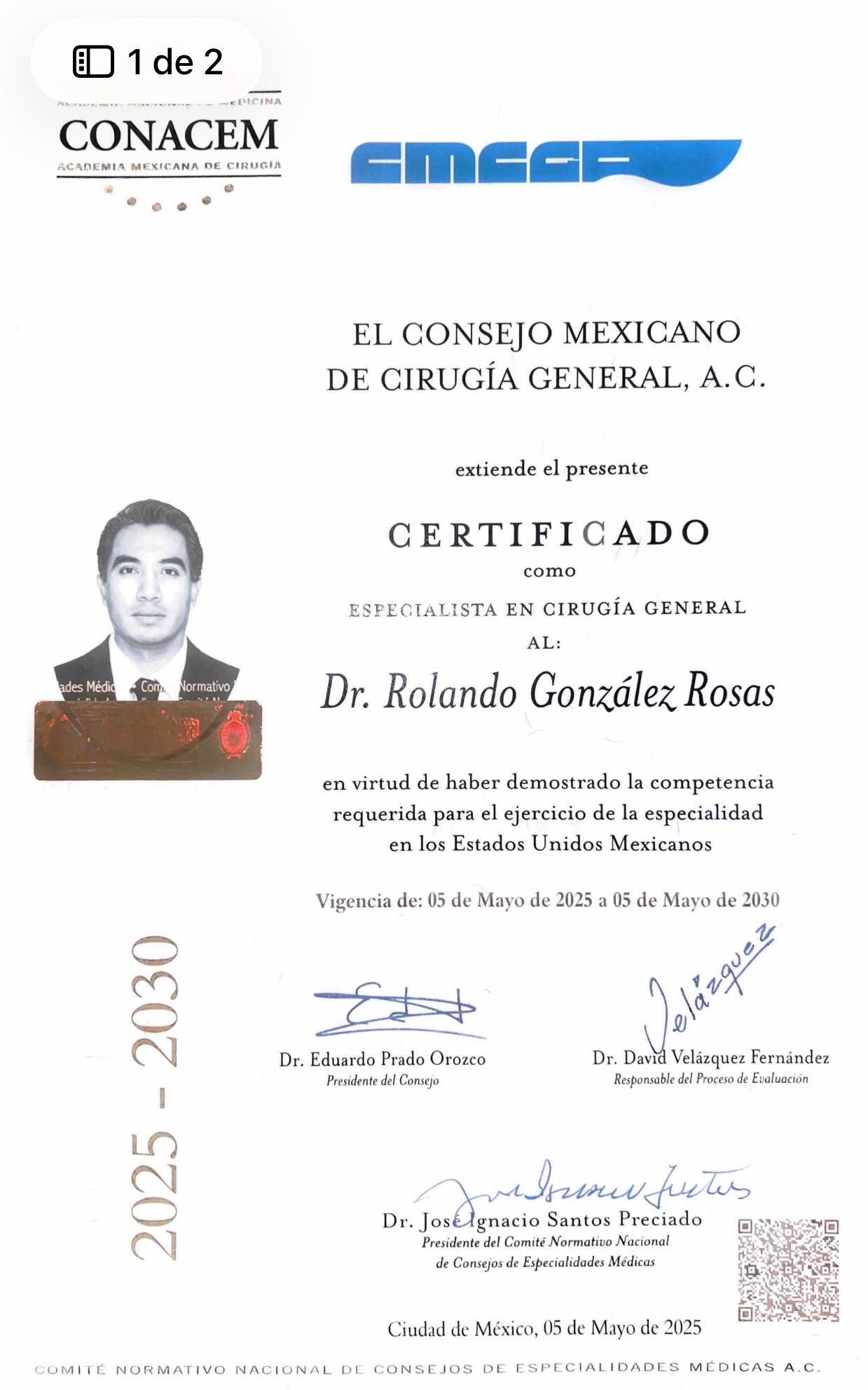 Cirugía General y LaparoscópicaEspecialista certificado por el CMCGAtención profesional