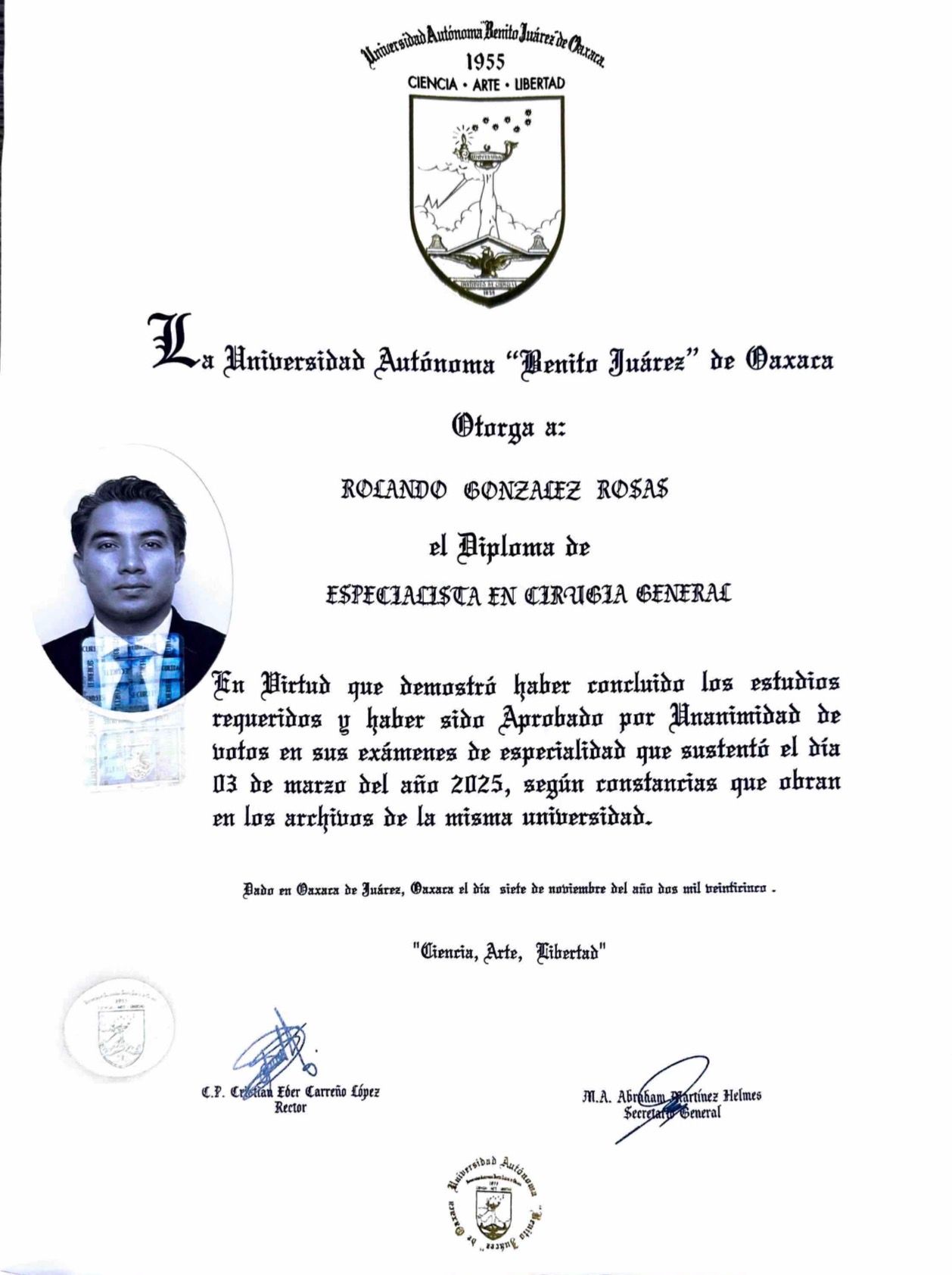 Quiero contarte un poco más de mí y en lo que me especializo. Mi formación académica está avalada por la Universidad Regional del Sureste de donde me licencié como Médico Cirujano, posteriormente decidí que la Cirugía sería la doctrina a la que me quería dedicar el resto de mi vida y afortunadamente así fue. Me formé como especialista en Cirugía General en el Hospital Regional Presidente Juárez ISSSTE de Oaxaca. Estoy certificado por el Consejo Mexicano de Cirugía General.