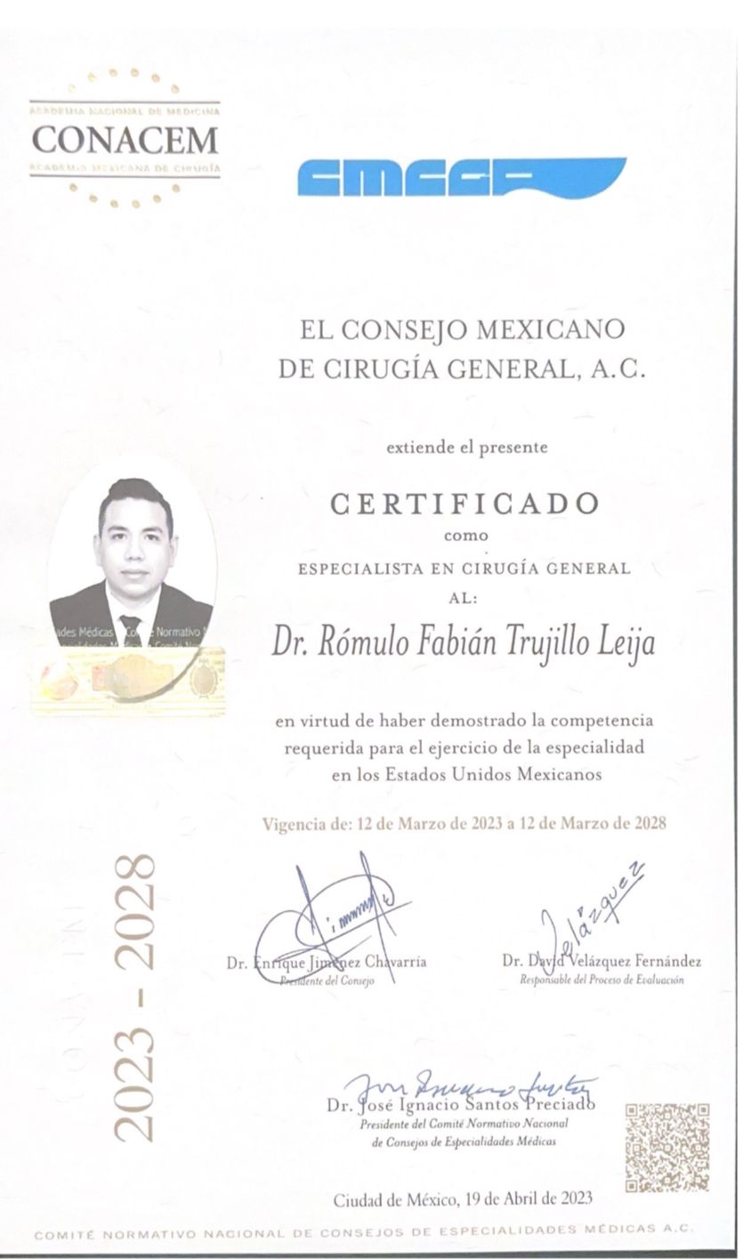 Soy especialista en Cirugía General con más de 7 años de experiencia, enfocado en el diagnóstico y tratamiento quirúrgico de enfermedades abdominales, tanto electivas como de urgencia.