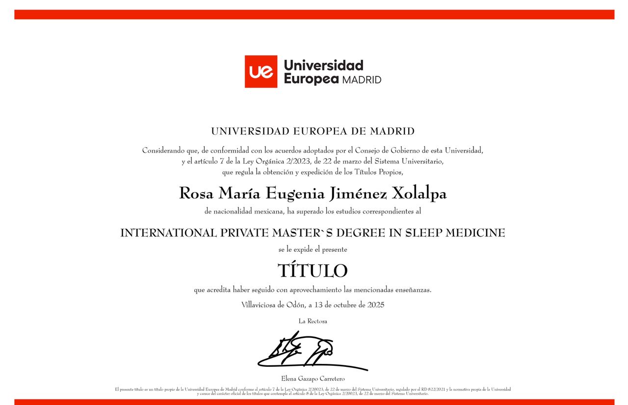 Especialista en Medicina de Sueño y Neurodesarrollo, cuento con un doctorado en la Clínica de la sueño UAM en niños con autismo. Realicé el Master en Medicina de Sueño, En la Universidad Europea de Madrid. Soy ponente en diversos cursos y diplomados de Medicina de sueño. Soy miembro de la Sociedad Mexicana para la Investigación y medicina de Sueño. Cuento con diplomados y cursos de actualización en Medicina de Sueño.