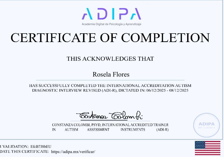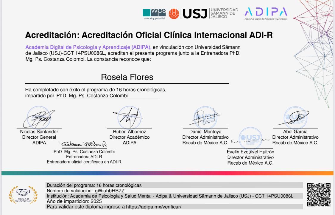 Estoy profundamente agradecida con la Psicóloga Rosela Flores por su excepcional profesionalismo, conocimiento y calidez durante el proceso de diagnóstico de autismo de mi hijo. Desde el primer momento, nos sentimos escuchados y comprendidos.