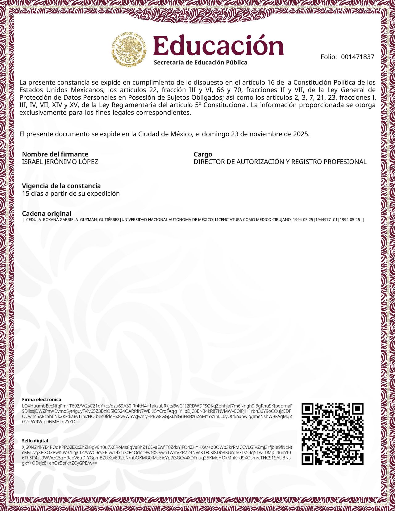 Mi nombre es Roxana Gabriela Guzmán Gutiérrez. Soy médico cirujana, egresada de la Facultad de Medicina de la Universidad Nacional Autónoma de México (UNAM) en el año 1994. Desde muy joven tuve un profundo interés por las ciencias de la salud, especialmente por la forma en que el conocimiento médico puede transformar de manera directa la calidad de vida de las personas.