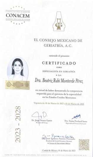 Soy la Dra. Rubi Monterde, especialista en Geriatría. Acompaño a las personas adultas mayores y a sus familias en cada etapa, con un enfoque integral y humano. Me gusta escuchar, orientar y brindar un espacio de confianza donde puedan sentirse cuidados y comprendidos. Será un gusto apoyarte en tu salud.