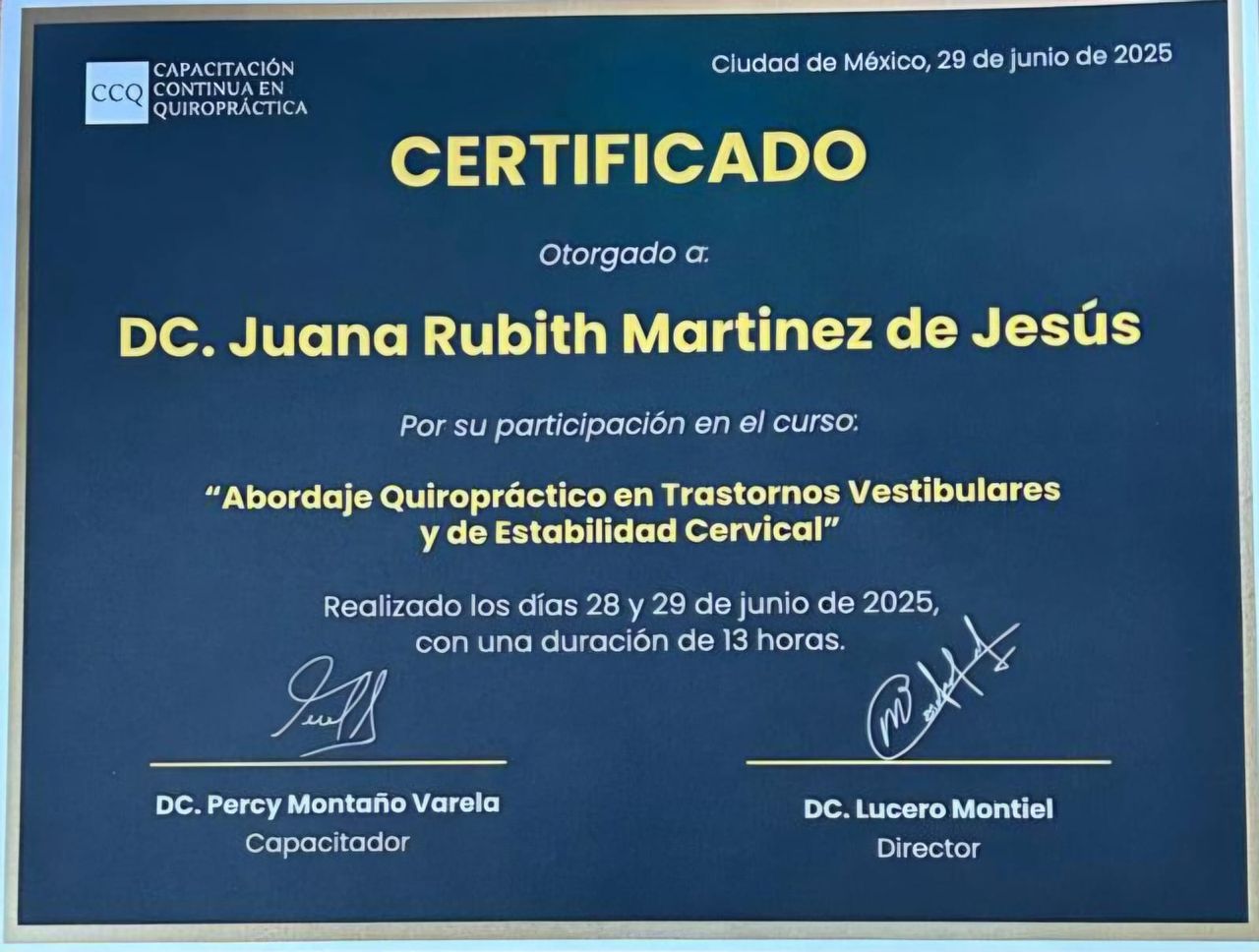 Durante estos años de práctica mi preparación continúa, pues sé que cada día se aprende y mejora, por ello asisto a Seminarios, Talleres y Congresos de Quiropráctica Pediátrica, Quiropráctica Deportiva, Seminarios de Filosofía, Técnica Activador, Técnica Gonstead, Ajuste de Extremidades y Certificación en Técnica Thompson.