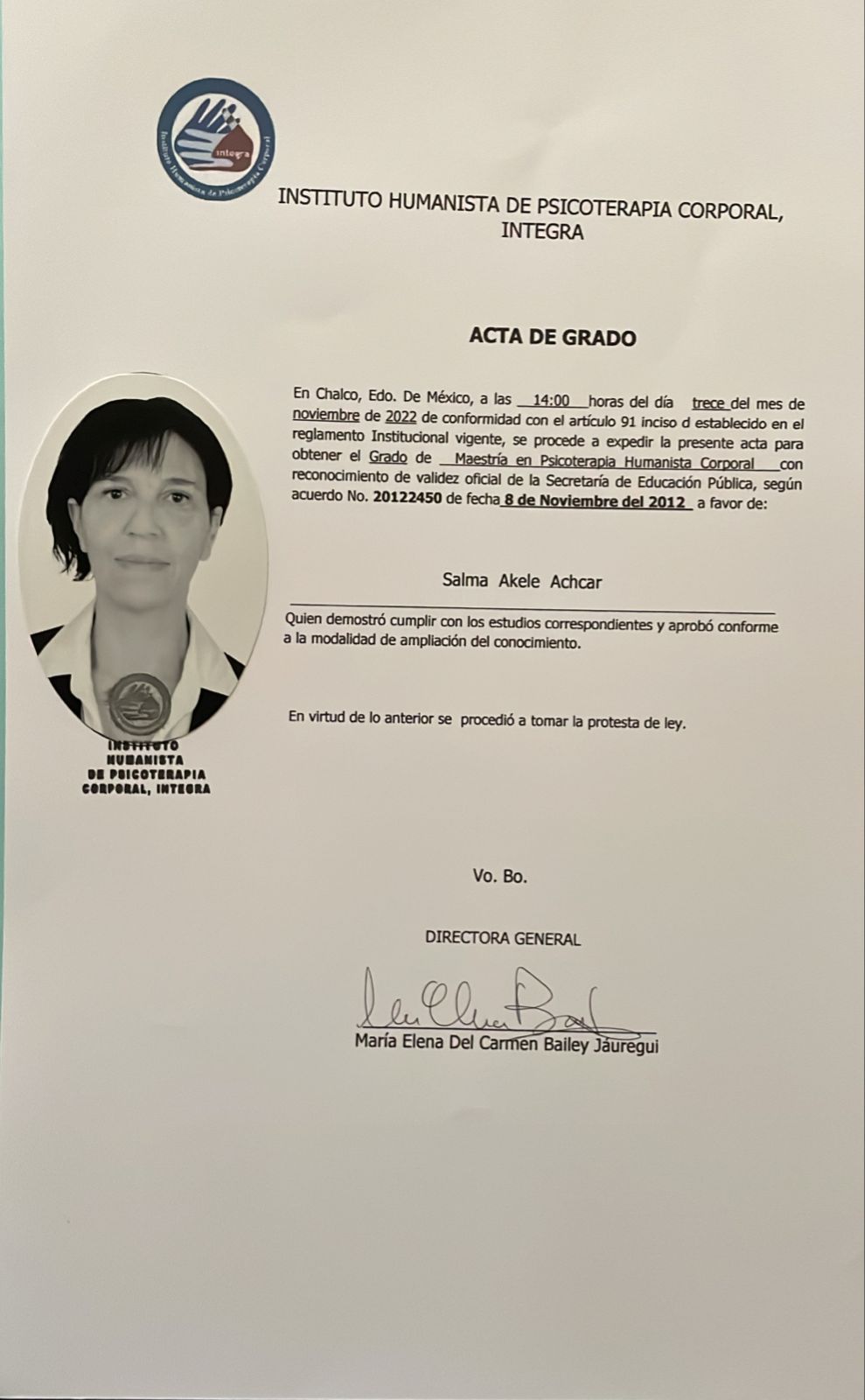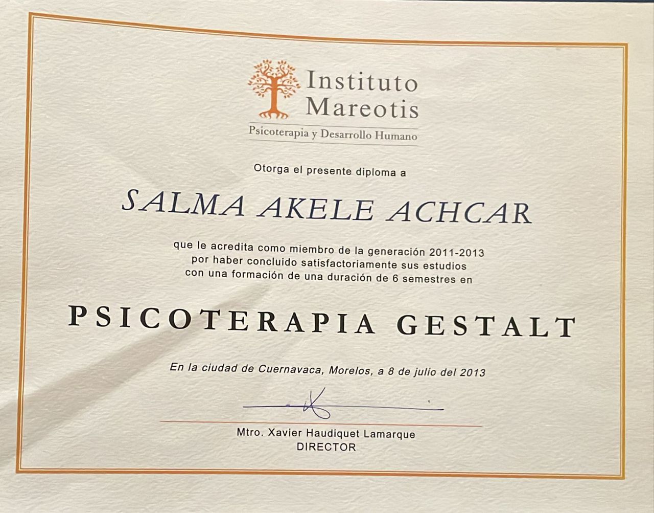 Estoy graduada y certificada en Psicoterapia Gestalt y Desarrollo Humano por el Instituto de Mareotis, bajo la dirección del T:G: Xabier Huadiquet Lamarque, y la maestria en Psicoterapia Humanista Corporal por el Instituto Humanista de Pscoterapia Corporal Integra, bajo la dirección de la Maestra Marilenca Bayley.