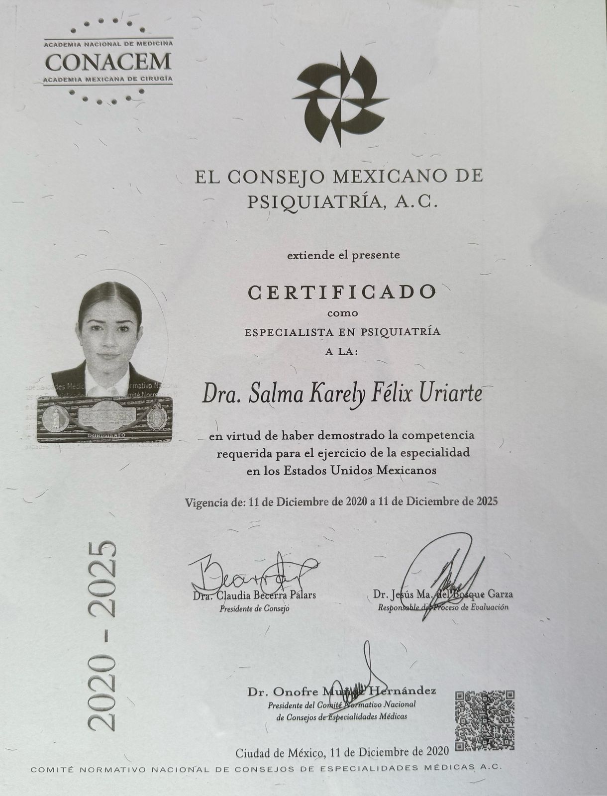 Soy la Dra. Salma Karely Félix Uriarte, médico especialista en Psiquiatría con 5 años de experiencia . Mi objetivo profesional es acompañarte con empatía y compromiso en el proceso de recuperación de tu salud mental y emocional. A lo largo de mi formación y experiencia clínica, he confirmado que cada persona merece un espacio seguro, donde pueda ser escuchada sin juicios y recibir una atención profesional personalizada.