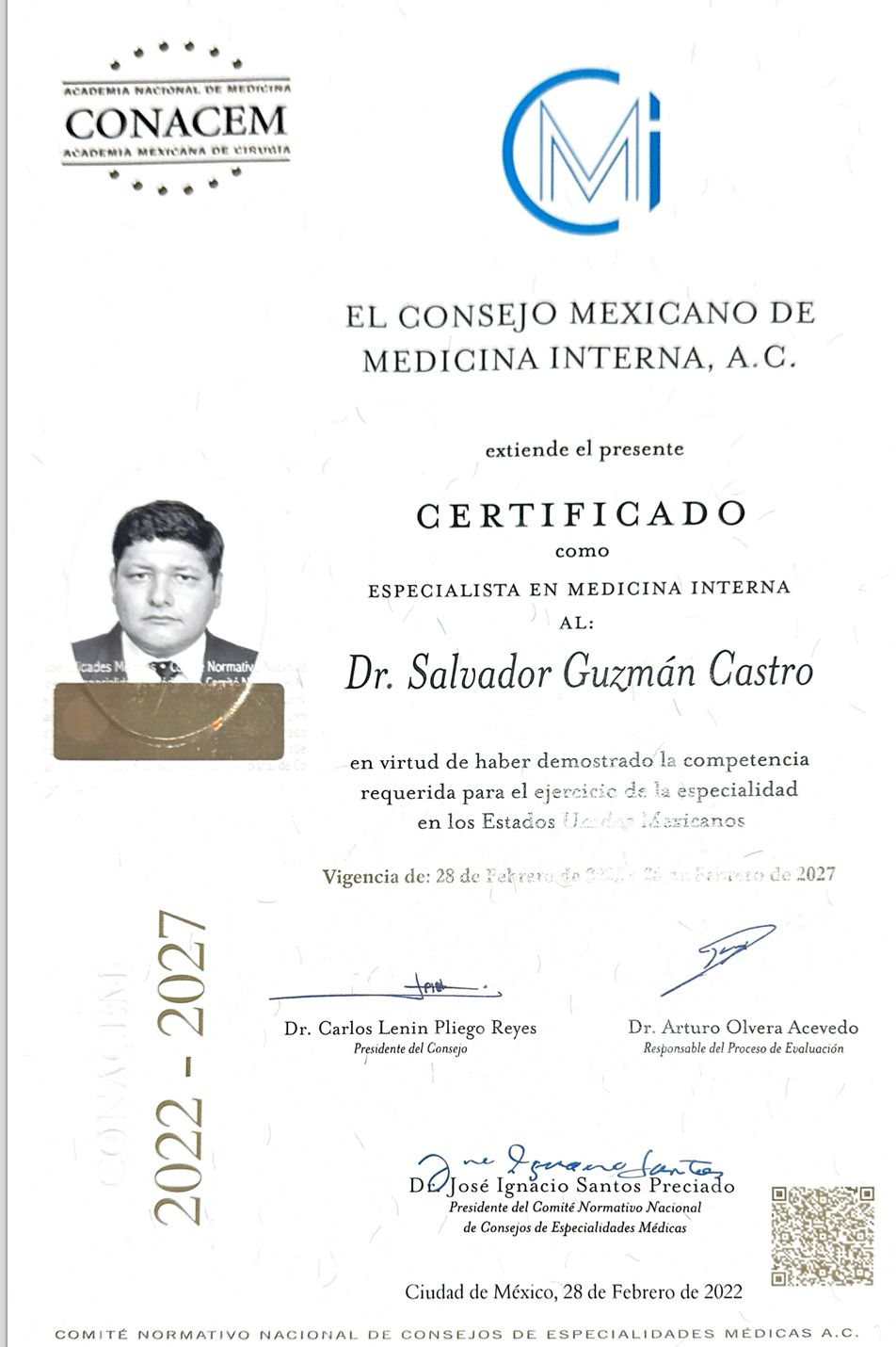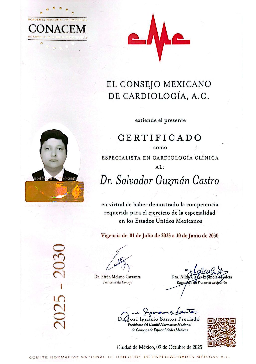 Soy el Dr. Salvador Guzmán, especialista en Medicina Interna y Cardiología Clínica con alta especialidad en Ecocardiografía.