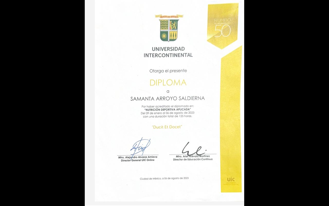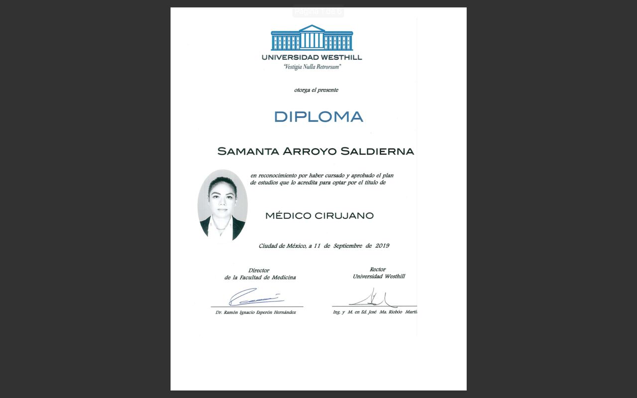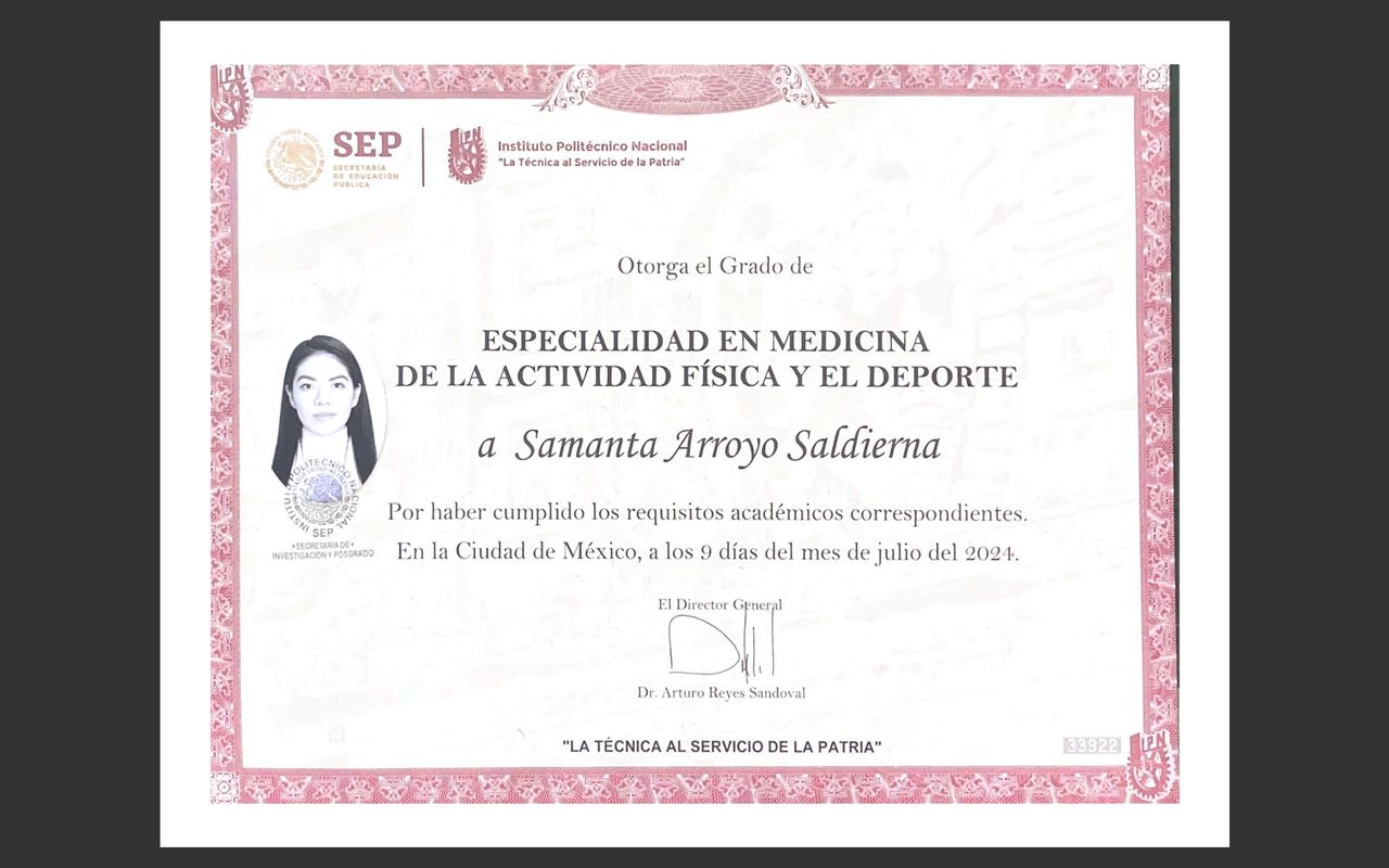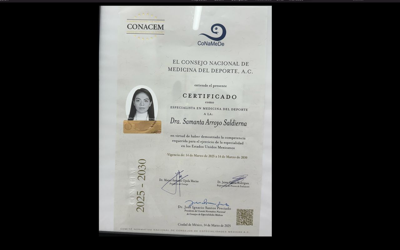 Soy la Dra. Samanta Arroyo Saldierna, médica especialista en Medicina del Deporte, comprometida con el bienestar integral, rendimiento físico y la recuperación funcional de mis pacientes.