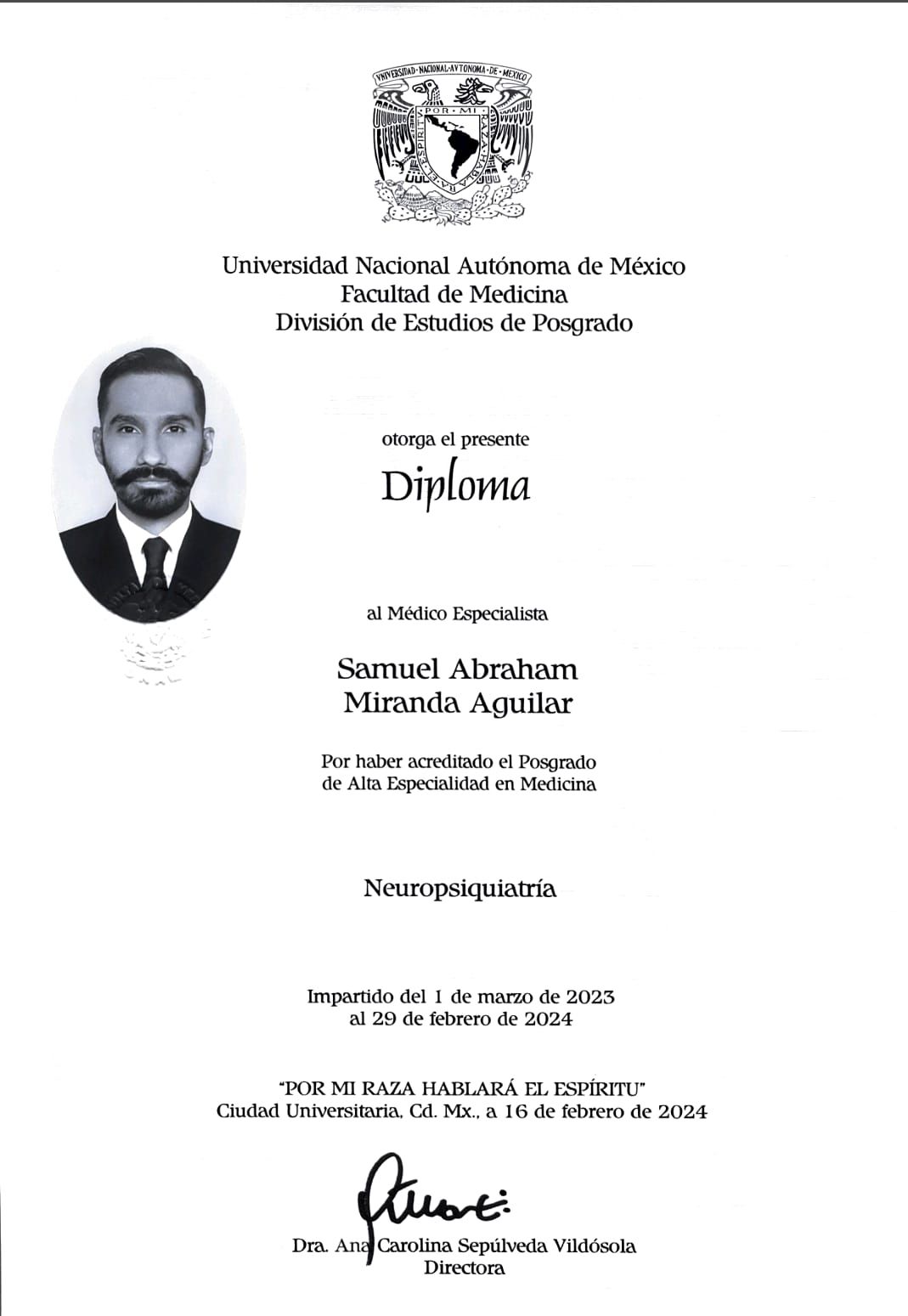 Alta Especialidad en Neuropsiquiatría en el Instituto de Neurología y Neurocirugía Manuel Velasco Suárez, UNAM.