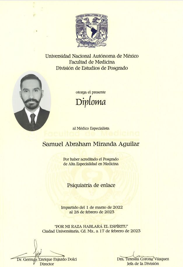 Alta Especialidad en Psiquiatría de Enlace en el Instituto Nacional de Nutrición y Ciencias Médicas Salvador Zubirán, UNAM.