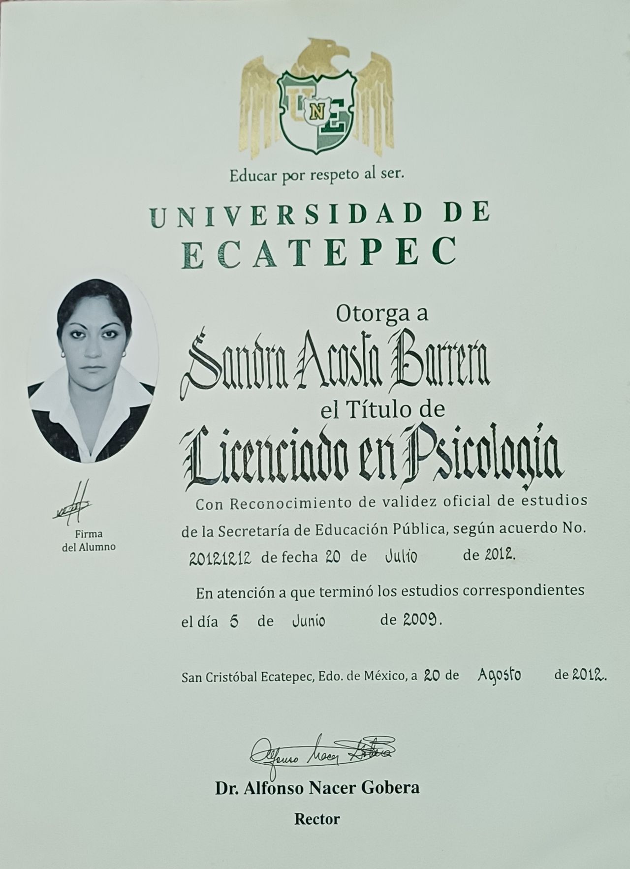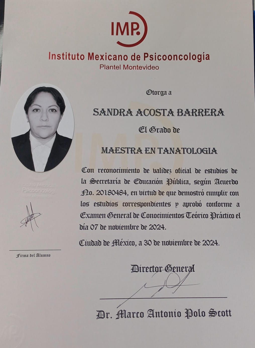 Te comparto brevemente de mi, soy Sandra Acosta Barrera, Licenciada en Psicología egresada de la UNE con enfoque Cognitivo Conductual, soy Maestrante en Tanatología egresada de IMPO.