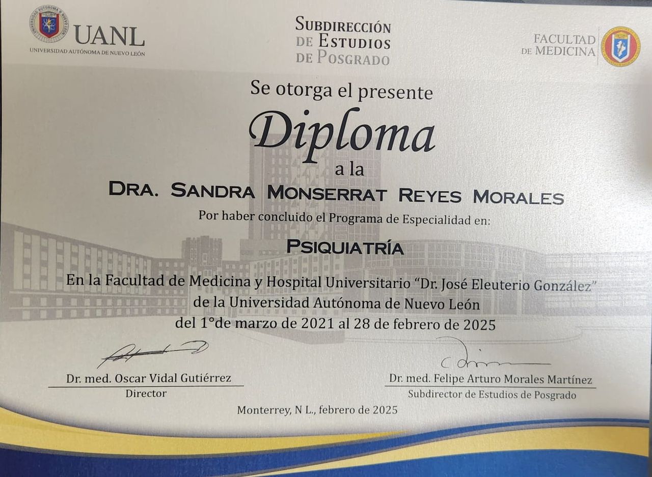 Soy médico especialista en Psiquiatría y Psicoterapia, con formación en la Facultad de Medicina de la Universidad Autónoma de Nuevo León (UANL), donde realicé la licenciatura en Medicina y la especialidad en Psiquiatría en el Hospital Universitario “Dr. José Eleuterio González”.