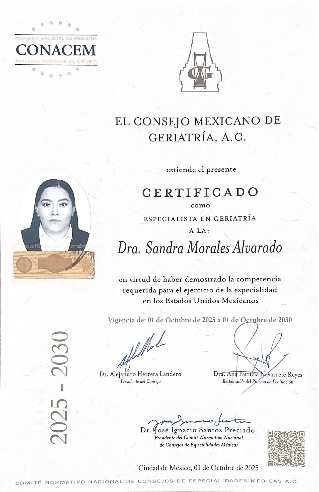 Especialista en Geriatría, egresada de la Universidad Autónoma de Querétaro y Certificada por el Consejo Mexicano de Geriatría.