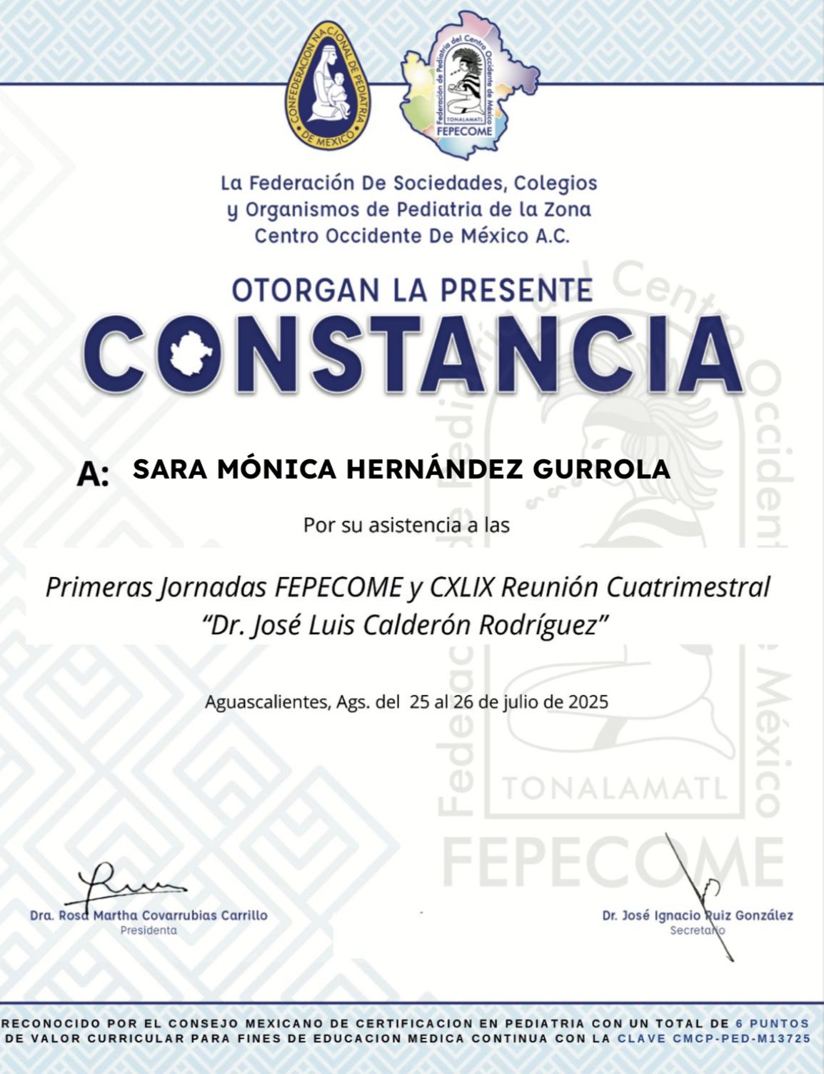 Soy la Dra. Sara Mónica Hernández Gurrola, médico cirujano egresada de la Universidad Juárez del Estado de Durango, ciudad que me vio nacer y crecer. Mi vocación por el bienestar infantil me llevó a especializarme en pediatría en el Hospital Centenario Miguel Hidalgo de Aguascalientes, donde adquirí sólidos conocimientos en el cuidado de niñas y niños.