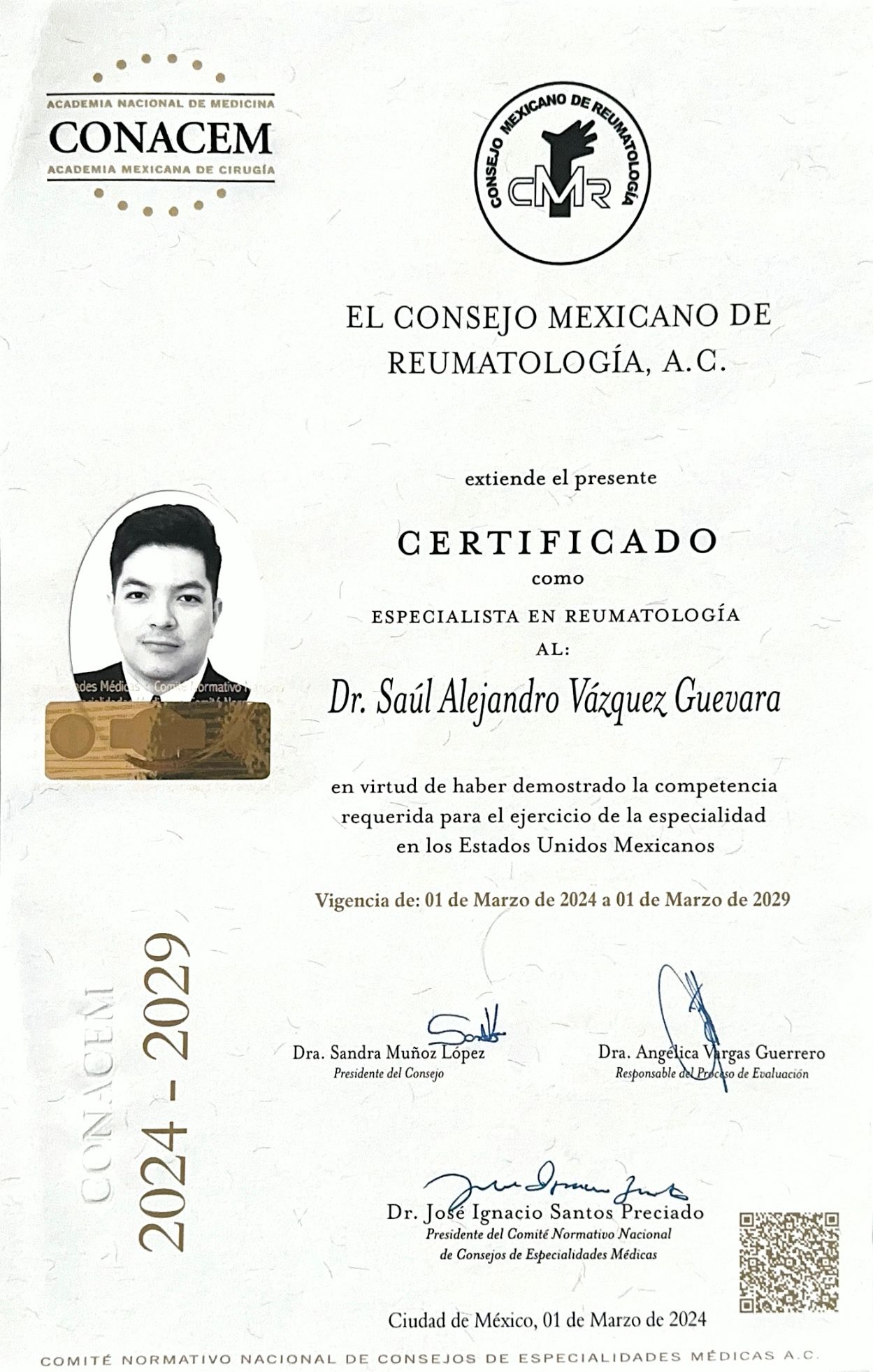 Hola! Soy el Dr. Saúl Vázquez, reumatólogo egresado del Centro Médico Nacional La Raza. Tengo una amplia experiencia en el manejo de todas las enfermedades reumatológicas, desde la Osteoartritis hasta las complicaciones graves del Lupus y las Vasculitis. También tengo experiencia en el manejo y seguimiento de estas enfermedades durante el embarazo, ya que la Raza cuenta con una clínica especializada en estos casos.
