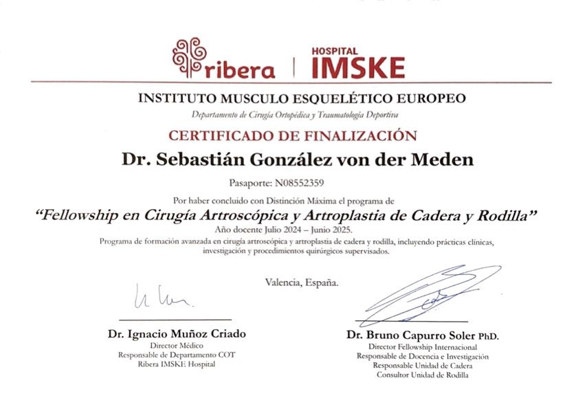 Desde el inicio de mi carrera me ha interesado la intersección entre el alto rendimiento físico, la precisión médica y la innovación clínica. Por eso, complementé mi formación en el Instituto Musculoesquelético Europeo (IMSKE) en Valencia, España, donde realicé fellowships en artroscopía y artroplastia avanzada de cadera y rodilla, así como en lesiones musculoesqueléticas deportivas y prótesis mínimamente invasivas. Durante esa etapa trabajé con atletas profesionales de distintos niveles, incluyendo equipos de primera división en fútbol y basketball, asi como bailarinas, corredores, y equipos de padel profesional y semiprofesional, entre otras disciplinas. Esto, con gran cercanía con mis pacientes ya que fuera del consultorio, me mantengo activo con el fútbol, padel, golf y el running, disciplinas que me ayudan a entender mejor el cuerpo en movimiento y a mantenerme conectado con el tipo de pacientes que atiendo.